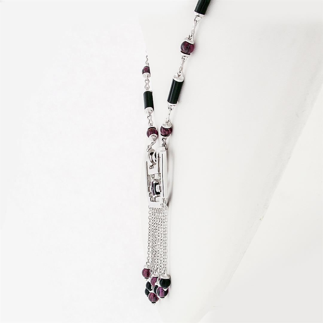 A solid 18k white gold tassel chandelier pendant necklace, with cylinder shape natural black onyx (8.8mm long x 3.8mm diameter), and 4 round bead cut natural black onyx (4.5mm), and 2 rectangular buff top cut natural black onyx (4.7x3mm), and 18 round bead cut natural rubellite tourmaline (4.5mm), and 2 square buff top cut natural ruby (2.7mm ), and 2 round brilliant cut natural ruby (), with 2 French baguette cut natural sapphires (3.9x2.7mm). 20 inch fancy link chain, 33.78 grams total weight, pendant measures 62.8x31.9mm.