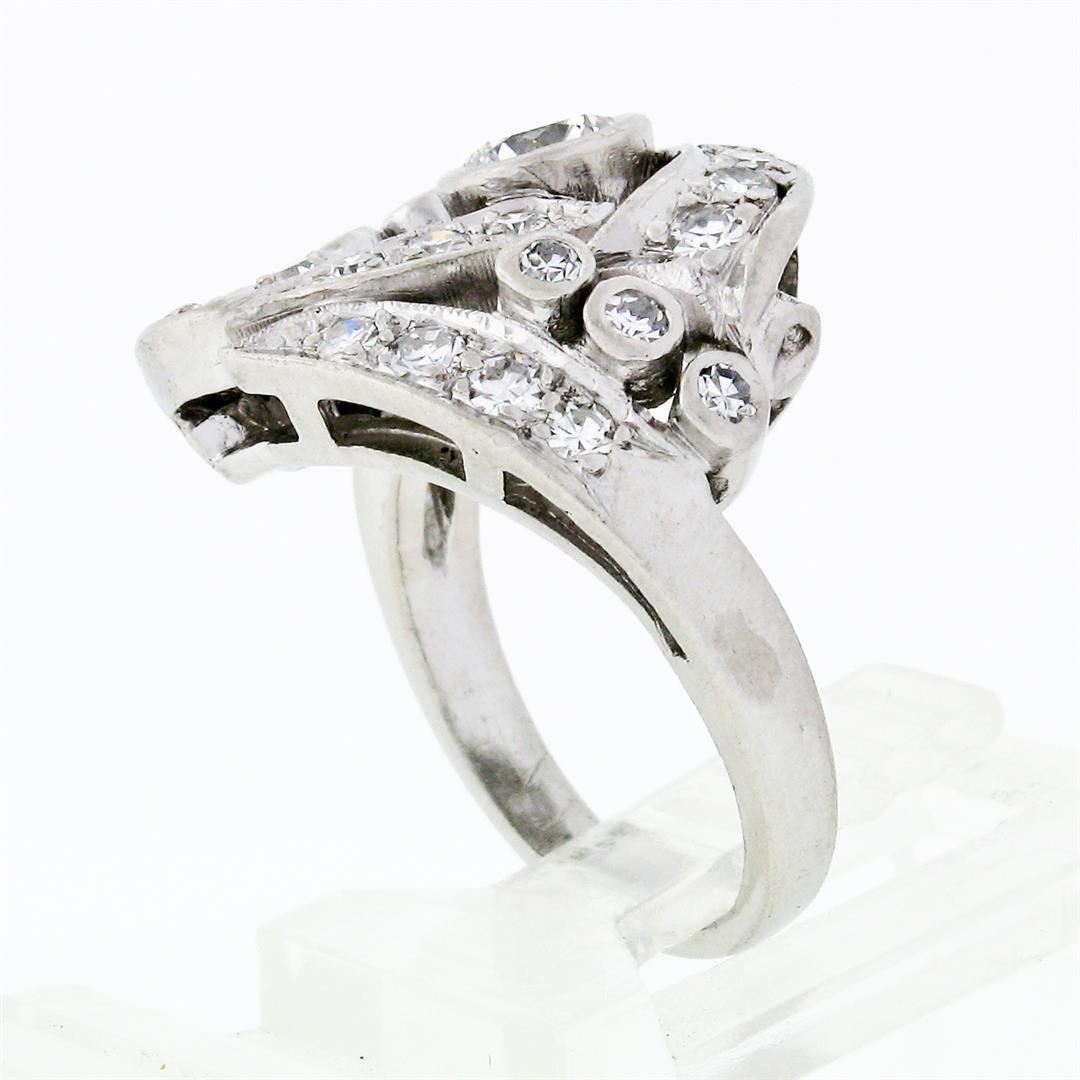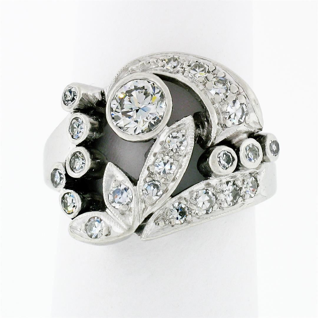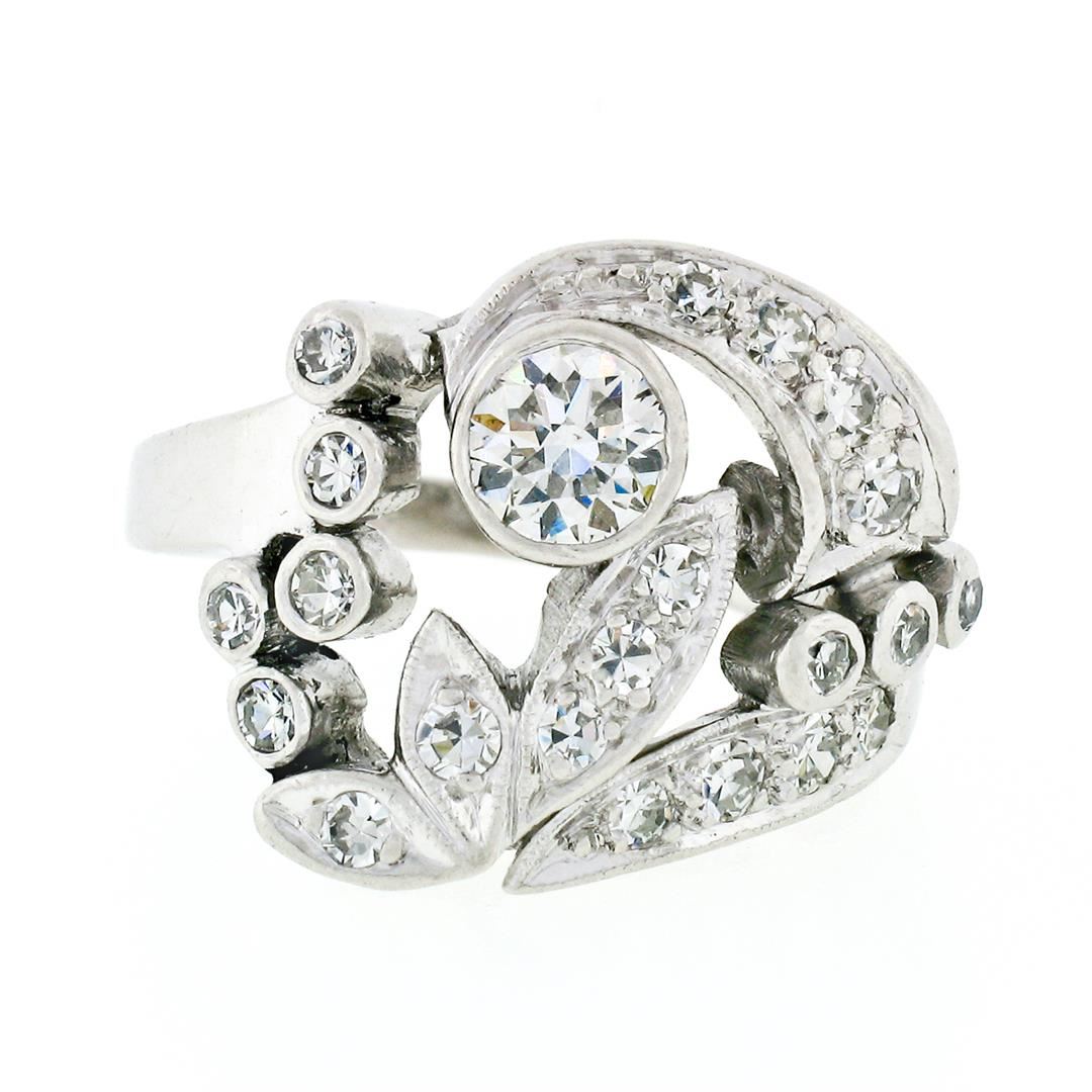 An art deco period solid platinum flower and leaf ring with 1 old European cut natural diamond (G - VS1; 0.46ctw) and 21 round single cut natural diamonds (F/G - VVS2/VS1; 0.78ctw). The ring is size 5.0, weighs a total of 9.79 grams, and measures 15.6mm wide.