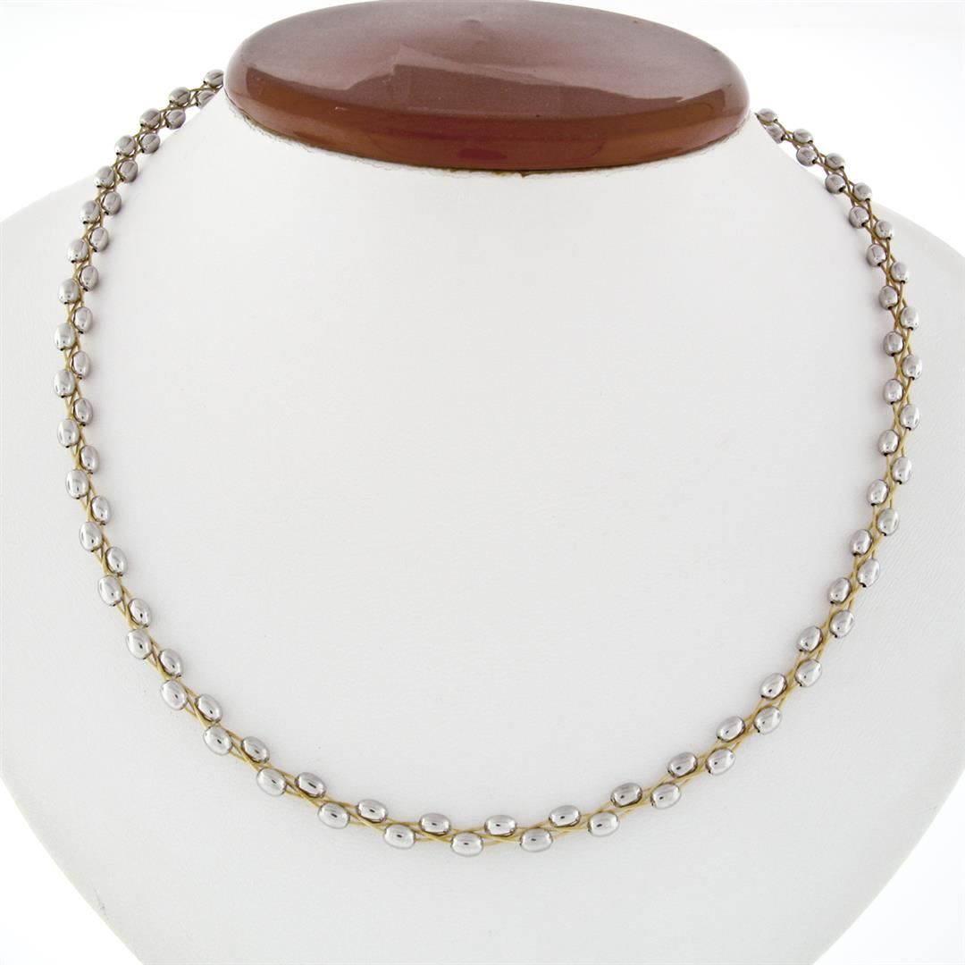 An estate solid 14k yellow and white gold necklace. 18 inch fine woven cable and bead link chain, 15.65 grams total weight.