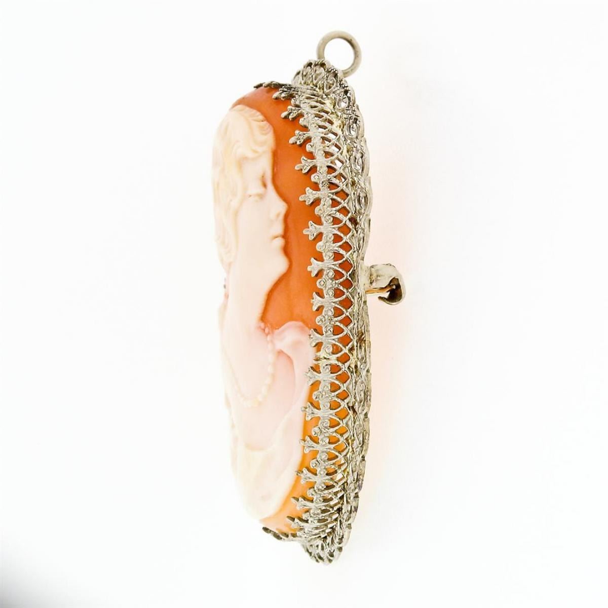 Fancy Vintage 14K Gold Carved Shell Cameo Etched Floral Filigree Brooch Pendant. A vintage solid 14k white gold brooch or pendant featuring an oval carved natural shell cameo (38.8x29.7mm) surrounded by a floral filigree frame. Measures 47.0x35.5mm and weighs a total of 11.65 grams.