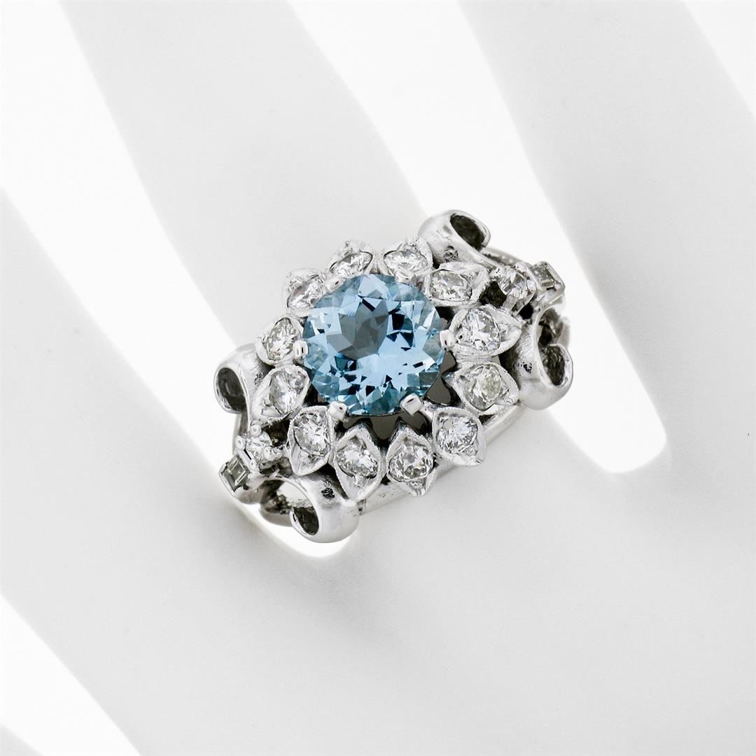 A vintage solid 14k white gold fancy cocktail ring, faeturing 1 round brilliant cut natural aquamarine (8.0mm - 1.82ct), with 14 old european and round transitional cut natural diamonds (G/H- VS1/VS2; 0.85ctw), and 2 straight baguette cut natural diamonds (G - VS1; 0.18ctw). The ring is size 8.5, weighs a total of 9.29 grams, and measures 15.50mm wide.