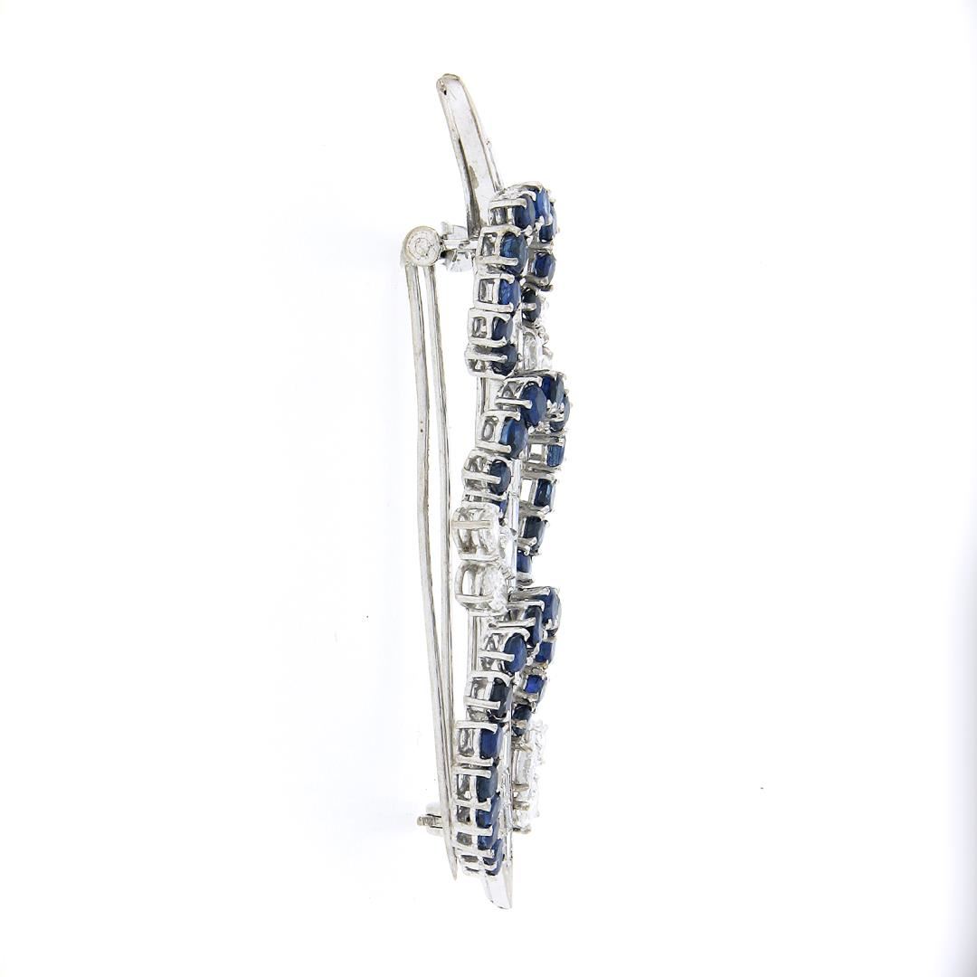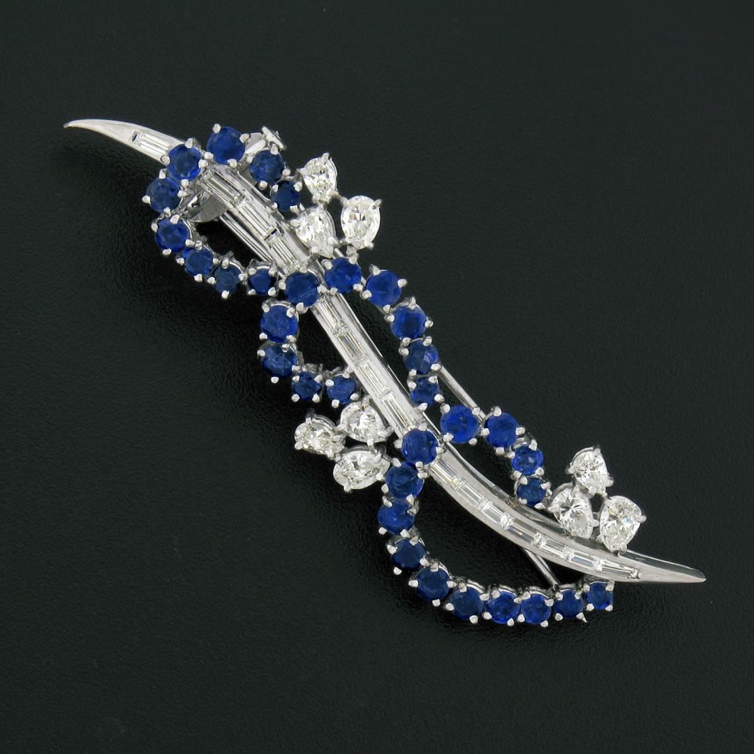 A vintage solid 18k white gold swirl brooch, with 9 pear cut natural diamonds (G/H - VS2/SI1 ; 1.70ctw), 15 baguette cut natural diamonds (G/H- VS1/VS2 ; 0.85ctw), and 33 round brilliant cut natural sapphires (3.50ctw ). Measures 18.60x62.20mm and weighs a total of 11.86 grams.