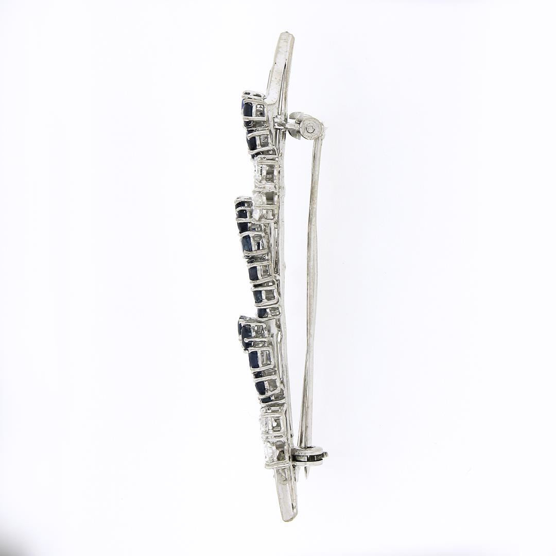 A vintage solid 18k white gold swirl brooch, with 9 pear cut natural diamonds (G/H - VS2/SI1 ; 1.70ctw), 15 baguette cut natural diamonds (G/H- VS1/VS2 ; 0.85ctw), and 33 round brilliant cut natural sapphires (3.50ctw ). Measures 18.60x62.20mm and weighs a total of 11.86 grams.