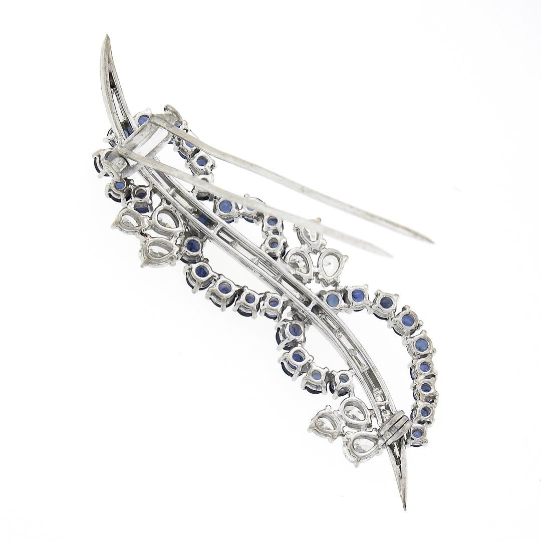 A vintage solid 18k white gold swirl brooch, with 9 pear cut natural diamonds (G/H - VS2/SI1 ; 1.70ctw), 15 baguette cut natural diamonds (G/H- VS1/VS2 ; 0.85ctw), and 33 round brilliant cut natural sapphires (3.50ctw ). Measures 18.60x62.20mm and weighs a total of 11.86 grams.