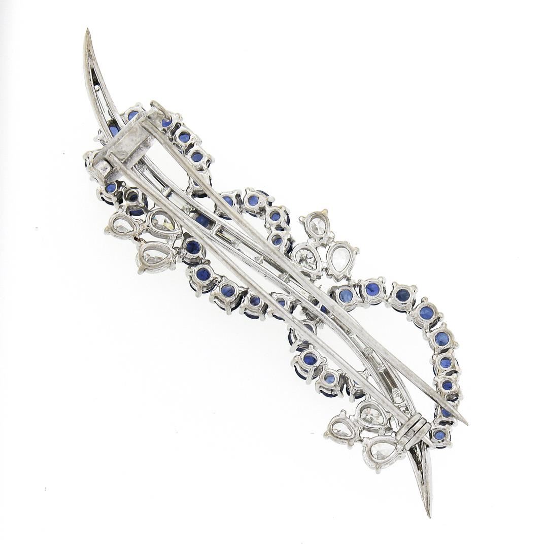 A vintage solid 18k white gold swirl brooch, with 9 pear cut natural diamonds (G/H - VS2/SI1 ; 1.70ctw), 15 baguette cut natural diamonds (G/H- VS1/VS2 ; 0.85ctw), and 33 round brilliant cut natural sapphires (3.50ctw ). Measures 18.60x62.20mm and weighs a total of 11.86 grams.