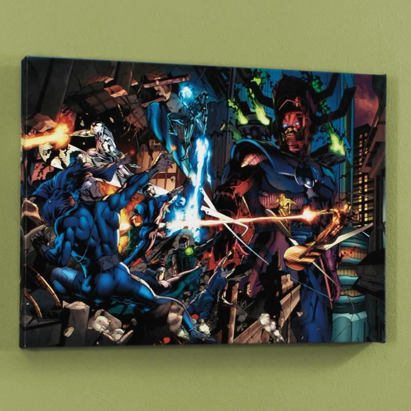 A piece of comic book history, this limited edition, from original art by Dale Eaglesham, depicts an action packed scene featuring the Fantastic Four. Dale Eaglesham is known for his work on titles like Conan, Punisher, Green Lantern, Villains United, Justice Society of America and Fantastic Four. In 2008, he won the Joe Shuster Award for Outstanding Canadian Comic Book Artist. "Fantastic Four #571" is a limited edition giclee on canvas by Dale Eaglesham presented by Marvel Comics! This piece comes gallery wrapped. Includes Certificate of Authenticity! Measures approx. 24" x 18" (image); 1.5" (depth).