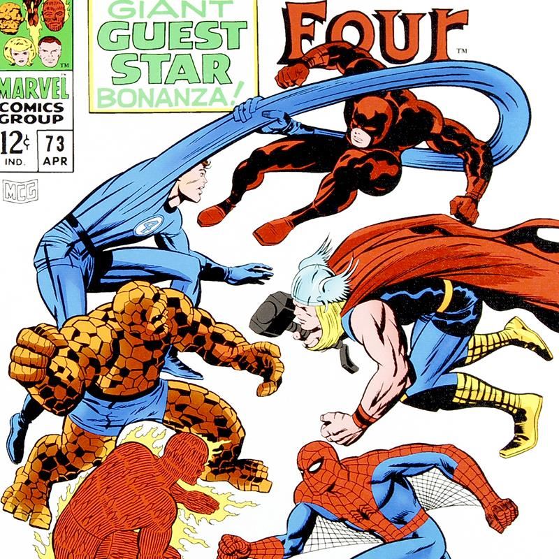A piece of comic book history, this limited edition print, drawn by Jack Kirby (1917-1994), depicts a classic Fantastic Four cover from 1968. Jack Kirby, along with the legendary Stan Lee, is credited with creating some of Marvel Comics' most popular characters, like The Fantastic Four, The Hulk, and the X-Men. In 1987, Kirby was one of the three inaugural inductees of the Will Eisner Comic Book Hall of Fame. "Fantastic Four #73" is a numbered limited edition giclee on canvas by Jack Kirby (1917-1994) presented by Marvel Comics. Includes Certificate of Authenticity! Measures approx. 15" x 22" (image).