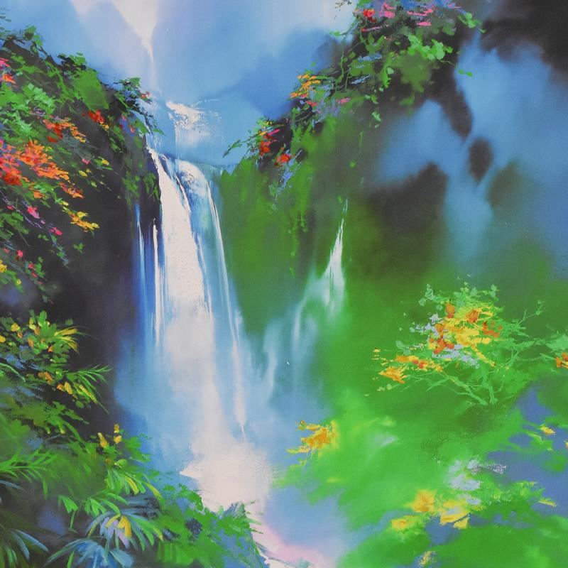 Fantasy Cascades by Leung, Thomas. Please see photos and description for all available information. "Fantasy Cascades" is a hand embellished limited edition giclee on canvas by Thomas Leung, numbered 11/100 and hand signed by the artist. Includes Letter of Authenticity. Measures approx. 23.5" x 35" (image). ** Please note: there are scuffs around the edge of the image due to being previously stretched; these imperfections may be concealed when the piece is framed. **