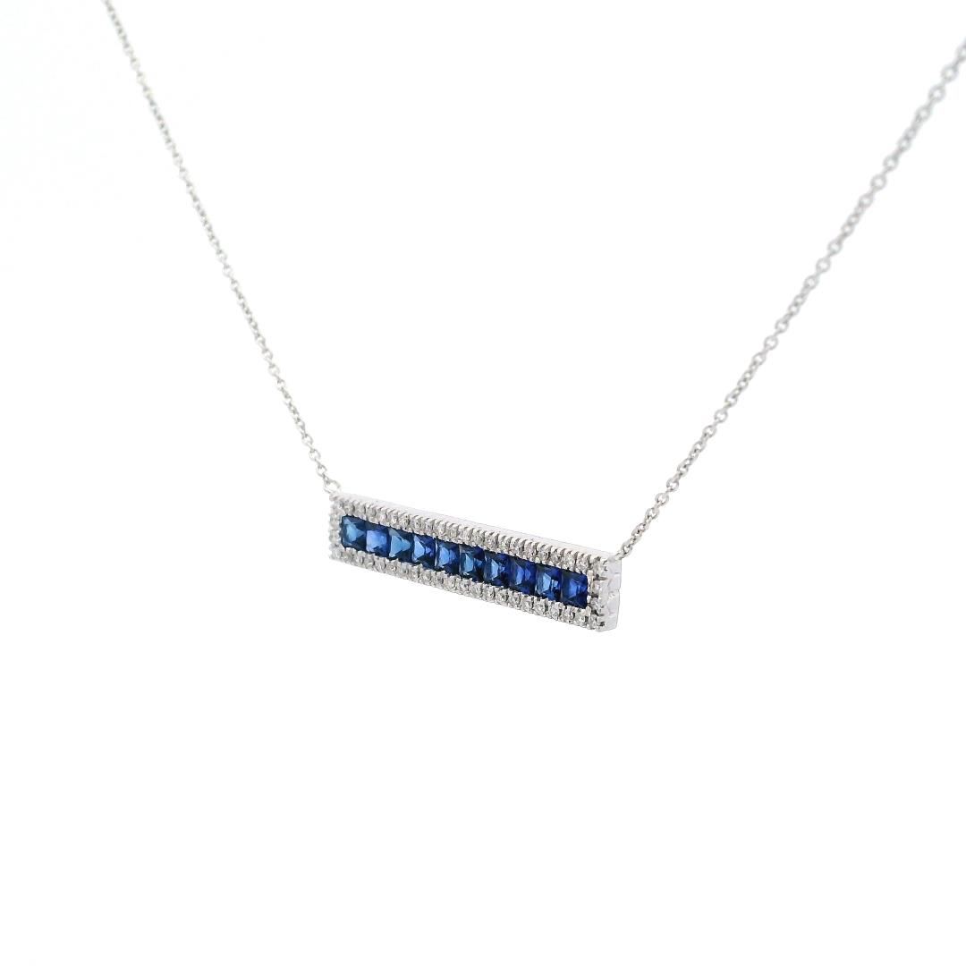 This modern 14kt white gold necklace showcases a rectangular halo design, featuring ten channel-set princess brilliant-cut natural blue sapphires totaling 1.02ct, with a medium strong blue color. Surrounding the sapphires are 48 prong-set round brilliant-cut diamonds, totaling 0.20ct, graded G-I in color, VS-2 to SI-1 in clarity, and Very Good cut. The 18-inch chain, adjustable to 16 inches, is secured with a lobster claw clasp, creating a sleek and sophisticated look.