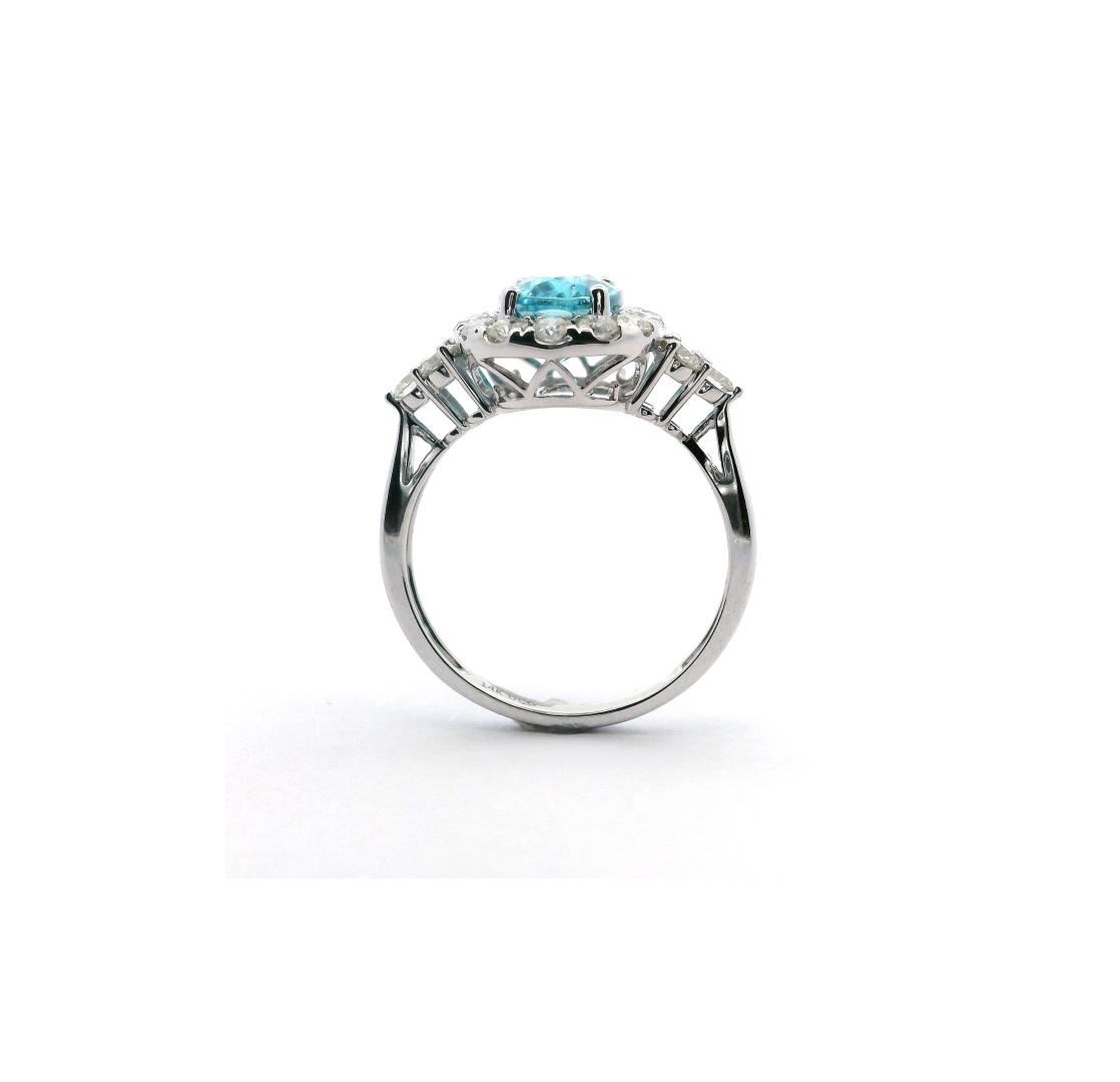 This 14KT white gold ring features a 3.00ct oval modified brilliant cut natural blue zircon, displaying a very strongly greenish-blue color. It is accented by twenty prong-set round diamonds totaling 0.86ct, graded G-H in color, VS-2 to SI-1 in clarity, and with a very good cut. The ring weighs 3.30 grams.