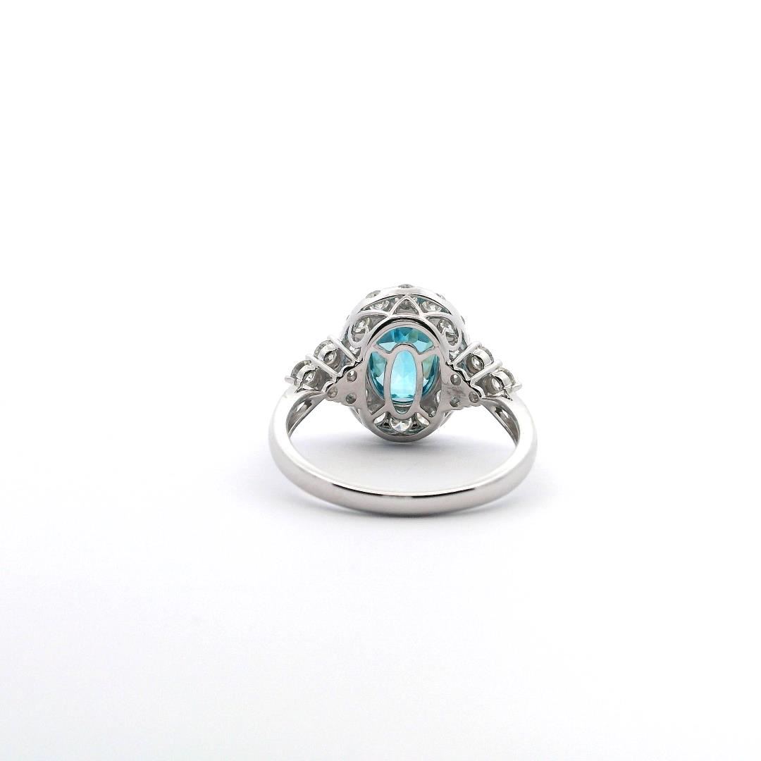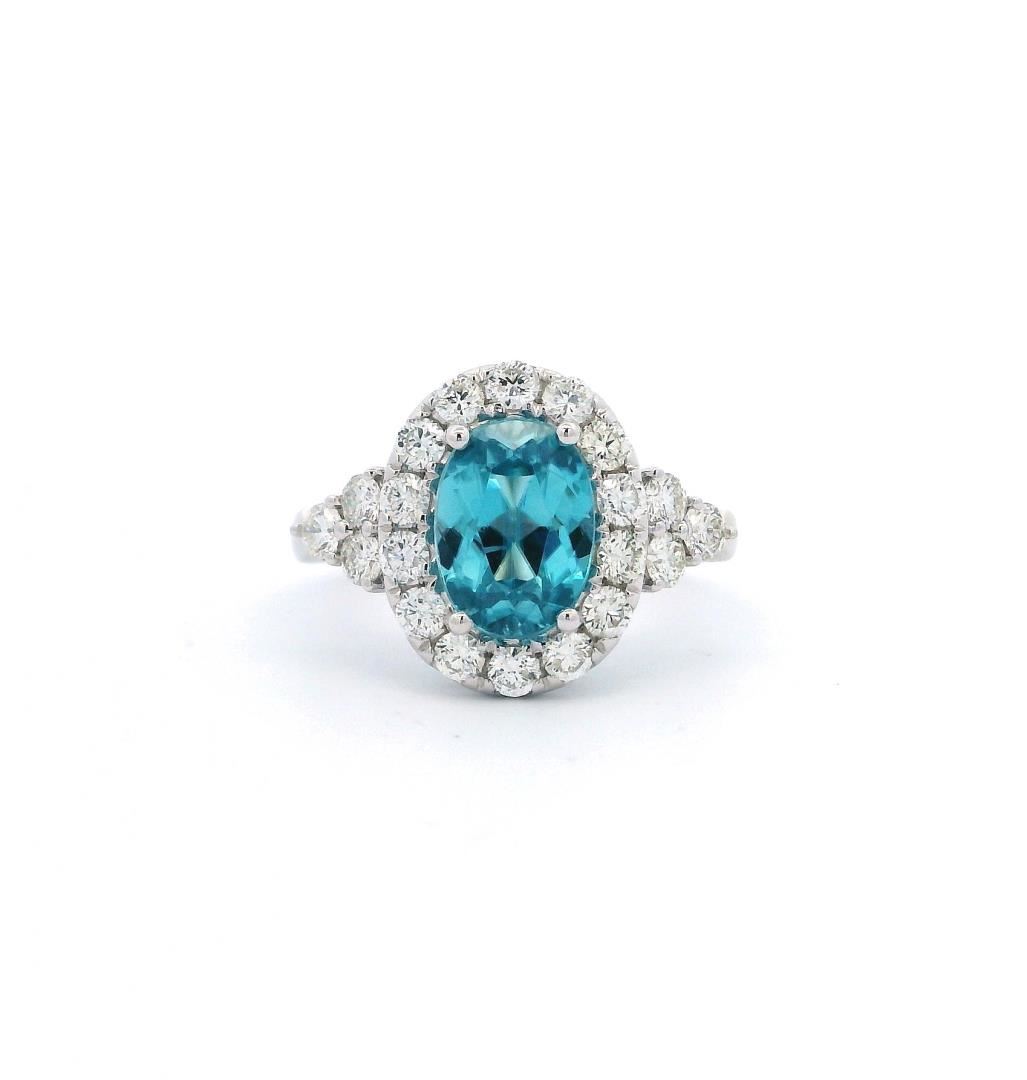 This 14KT white gold ring features a 3.00ct oval modified brilliant cut natural blue zircon, displaying a very strongly greenish-blue color. It is accented by twenty prong-set round diamonds totaling 0.86ct, graded G-H in color, VS-2 to SI-1 in clarity, and with a very good cut. The ring weighs 3.30 grams.