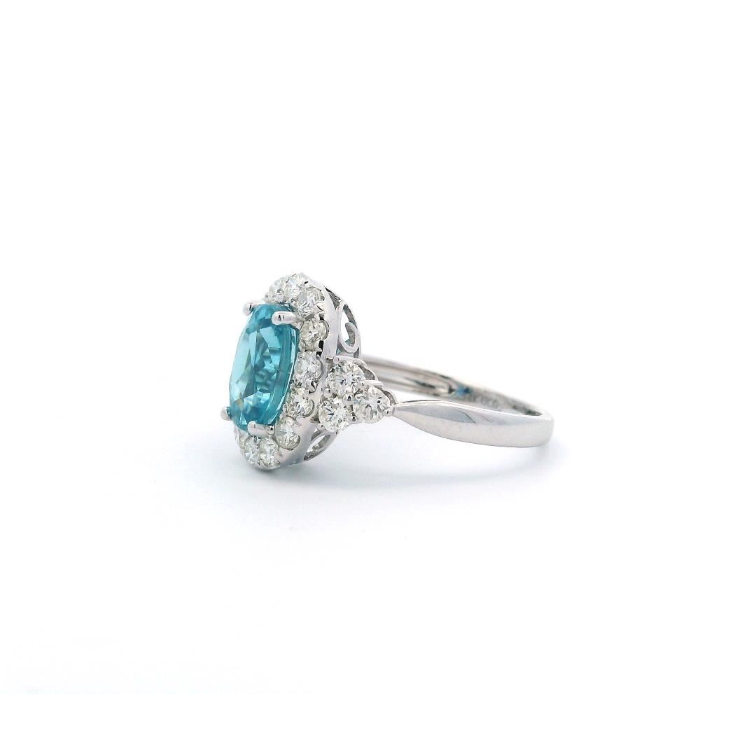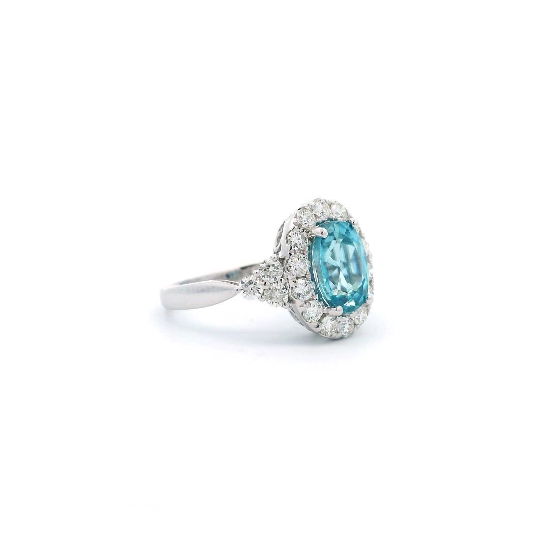This 14KT white gold ring features a 3.00ct oval modified brilliant cut natural blue zircon, displaying a very strongly greenish-blue color. It is accented by twenty prong-set round diamonds totaling 0.86ct, graded G-H in color, VS-2 to SI-1 in clarity, and with a very good cut. The ring weighs 3.30 grams.