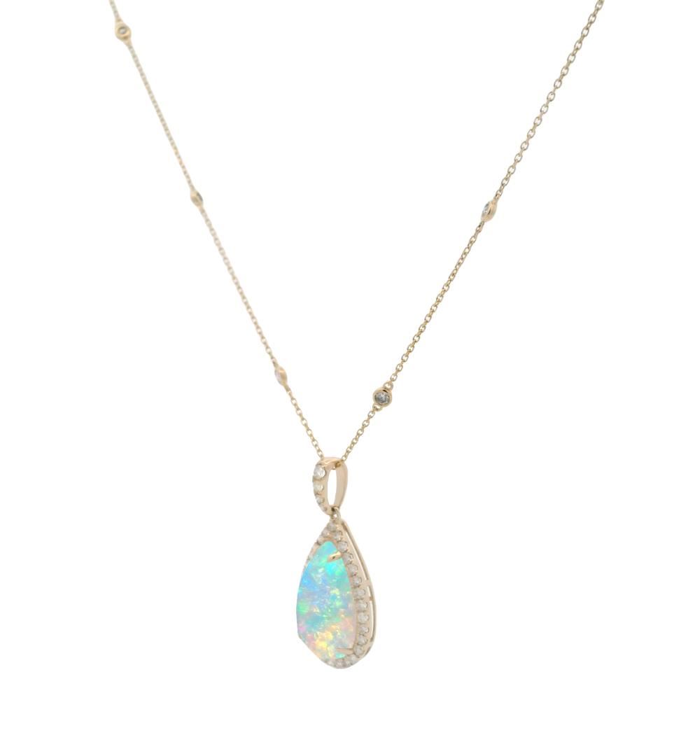 This 14KT yellow gold pendant features a 3.13ct pear-shaped cabochon-cut crystal opal with a bright blue-green play-of-color in a flashfire pattern. It is accented by thirty prong-set round diamonds totaling 0.40ct, four additional diamonds totaling 0.07ct, and ten bezel-set diamonds totaling 0.25ct. The diamonds are G-H color, VS-2 to SI-1 clarity, with a very good cut. The total weight of the pendant and chain is 3.70 grams.