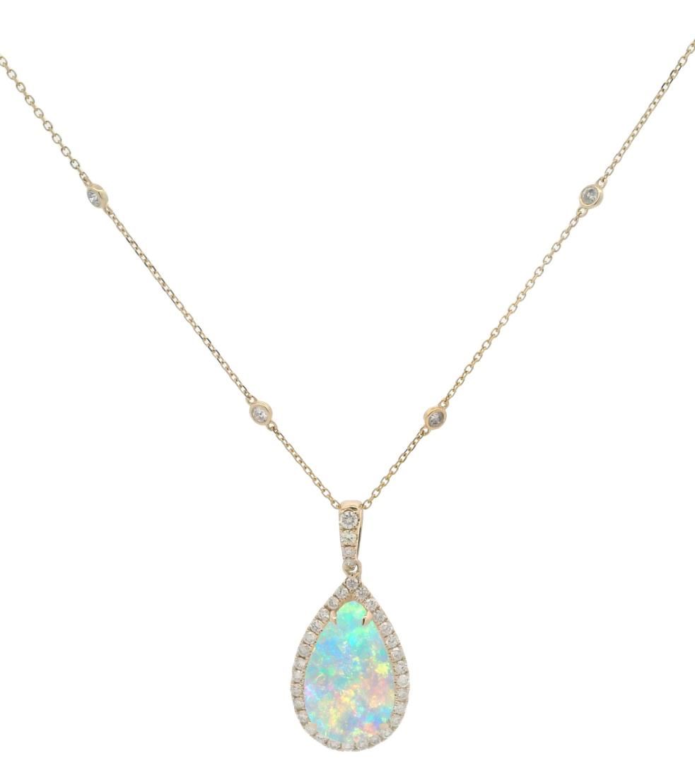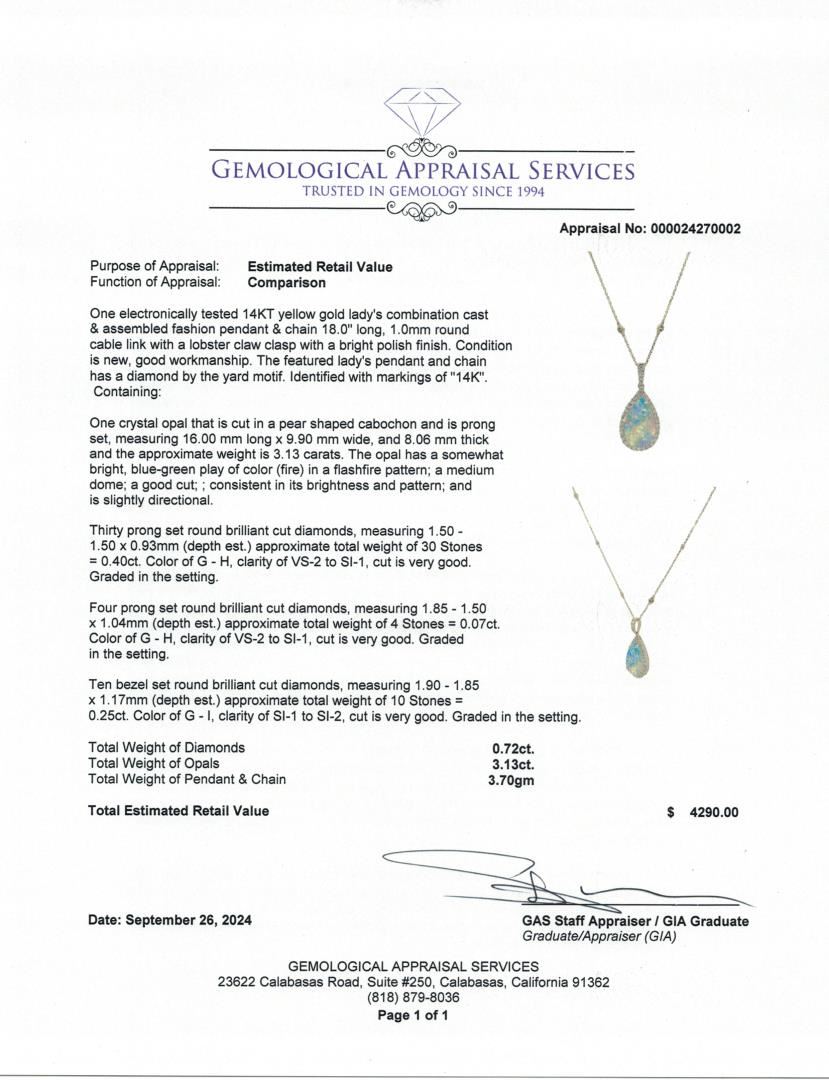 This 14KT yellow gold pendant features a 3.13ct pear-shaped cabochon-cut crystal opal with a bright blue-green play-of-color in a flashfire pattern. It is accented by thirty prong-set round diamonds totaling 0.40ct, four additional diamonds totaling 0.07ct, and ten bezel-set diamonds totaling 0.25ct. The diamonds are G-H color, VS-2 to SI-1 clarity, with a very good cut. The total weight of the pendant and chain is 3.70 grams.