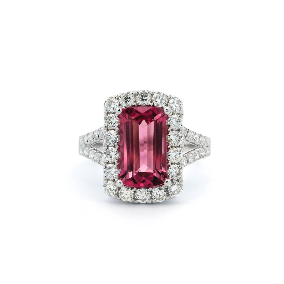 This 14kt white gold cushion halo ring features a striking 2.27ct prong-set rectangular cushion modified step-cut natural pink tourmaline, exhibiting a medium, slightly brownish purple-red hue with eye-clean clarity. Surrounding the center stone, 18 prong-set round brilliant-cut diamonds (0.72ct total) and 20 additional prong-set round brilliant-cut diamonds (0.25ct total) add a brilliant halo effect, all graded G-H in color, VS-2 to SI-1 in clarity, and Very Good cut. The basket motif setting and 2mm shank width enhance the elegance of this radiant piece.