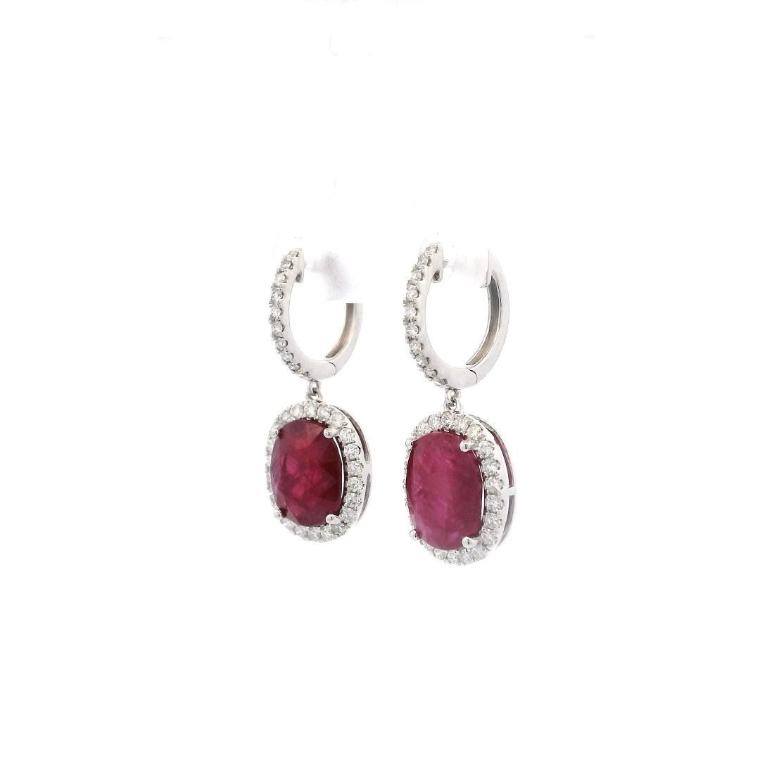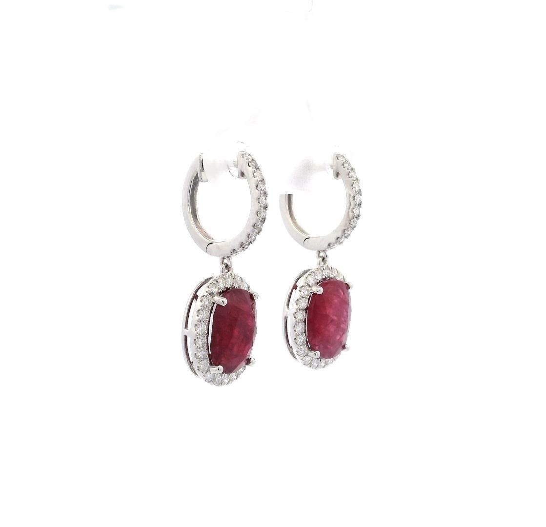 A pair of 14KT white gold halo dangle earrings featuring two oval natural rubies totaling 7.11ct. The earrings, measuring 28mm in length, are surrounded by 0.69ct of round brilliant cut diamonds with VS-2 to SI-2 clarity. Secured with hinged snap-locking posts.