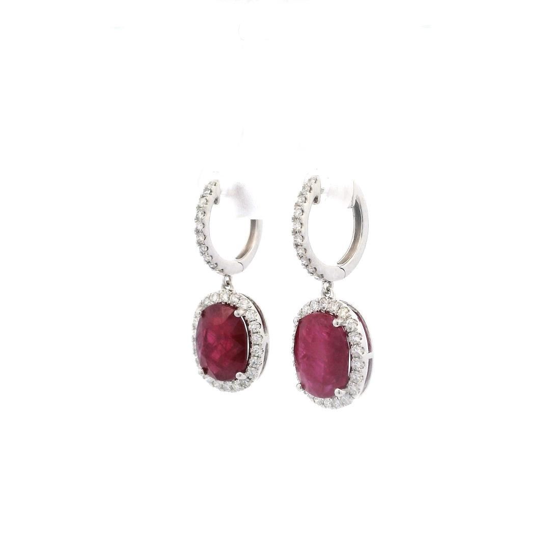 A pair of 14KT white gold halo dangle earrings featuring two oval natural rubies totaling 7.11ct. The earrings, measuring 28mm in length, are surrounded by 0.69ct of round brilliant cut diamonds with VS-2 to SI-2 clarity. Secured with hinged snap-locking posts.