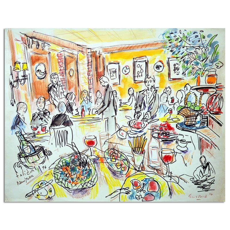 "Felidia Restaurant In New York City" is an original Mixed Media on Paper by Wayne Ensrud. The piece is hand signed by the artist and comes with a Certificate of Authenticity. Measures approximately 14.25" x 18.25".