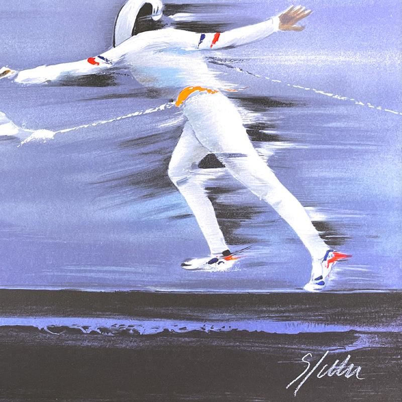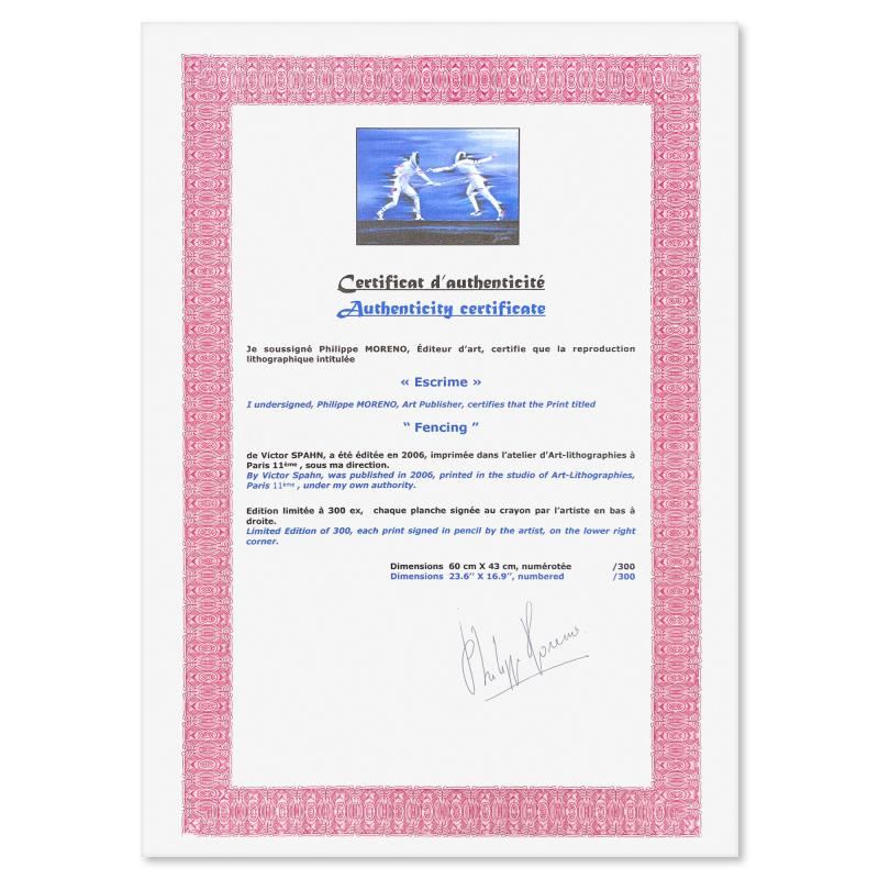 "Fencing" is a limited edition lithograph on paper by Victor Spahn. Printed at Art-Lithographies workshop in Paris, the piece is hand signed by the artist and comes with a certificate of authenticity. Measures approximately 17" x 23.5" (image).