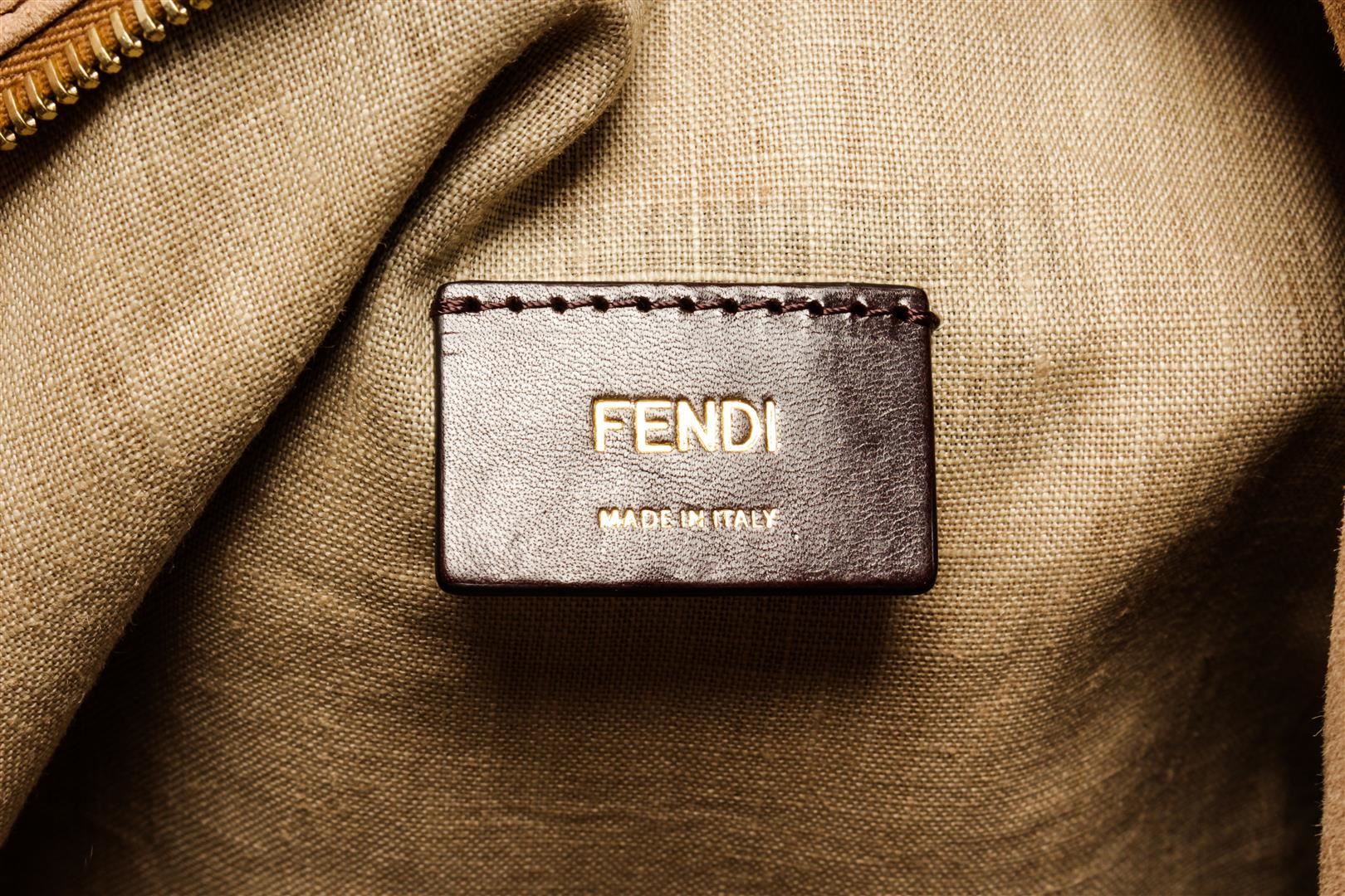 One Fendi Beige Open Tote Suede Handbag. Item is sold AS-IS. All available information is listed in the description and shown in the photo. Fendi Beige Open Tote Suede Handbag with dual brown leather top handles, fabric interior, gold toned hardware and zip closure.