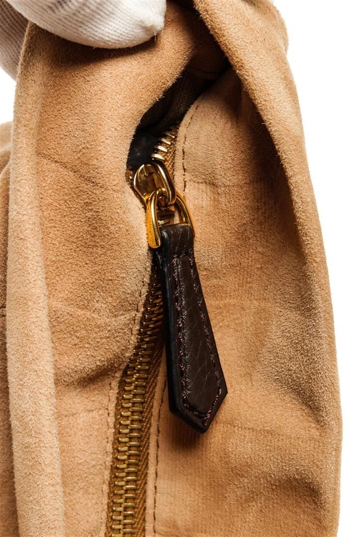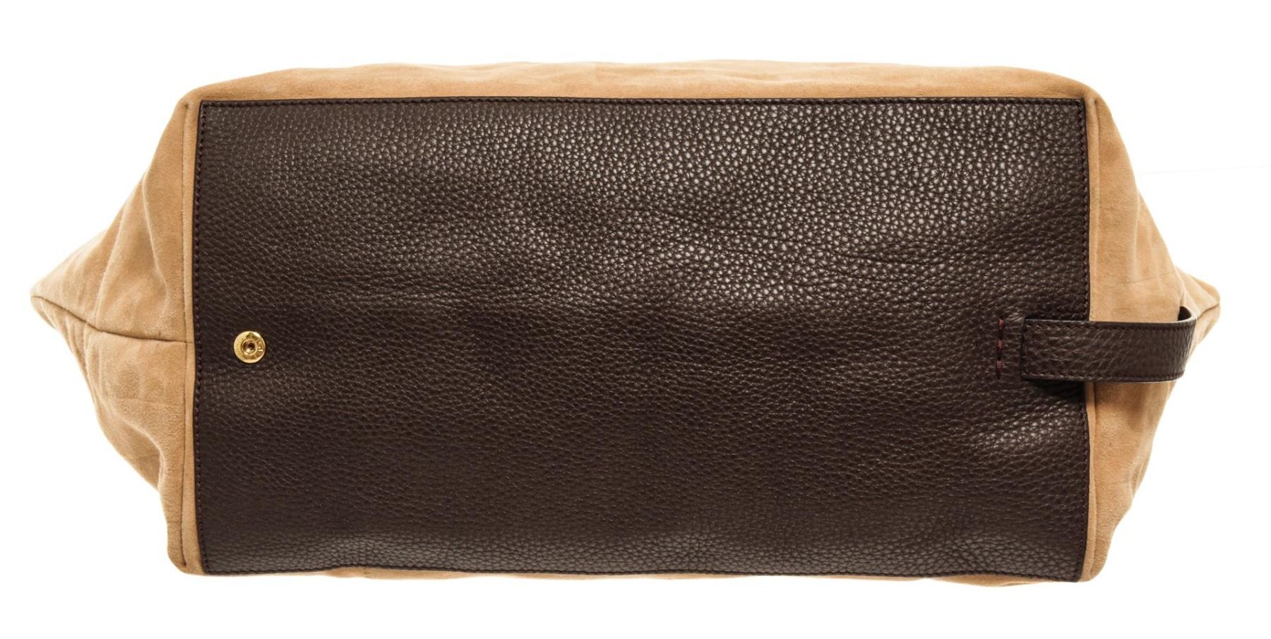 One Fendi Beige Open Tote Suede Handbag. Item is sold AS-IS. All available information is listed in the description and shown in the photo. Fendi Beige Open Tote Suede Handbag with dual brown leather top handles, fabric interior, gold toned hardware and zip closure.