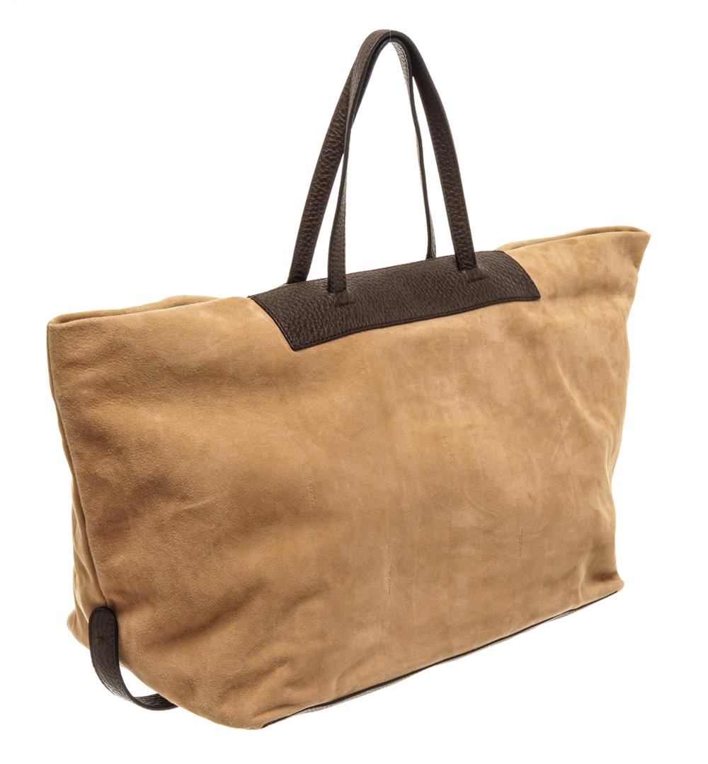 One Fendi Beige Open Tote Suede Handbag. Item is sold AS-IS. All available information is listed in the description and shown in the photo. Fendi Beige Open Tote Suede Handbag with dual brown leather top handles, fabric interior, gold toned hardware and zip closure.