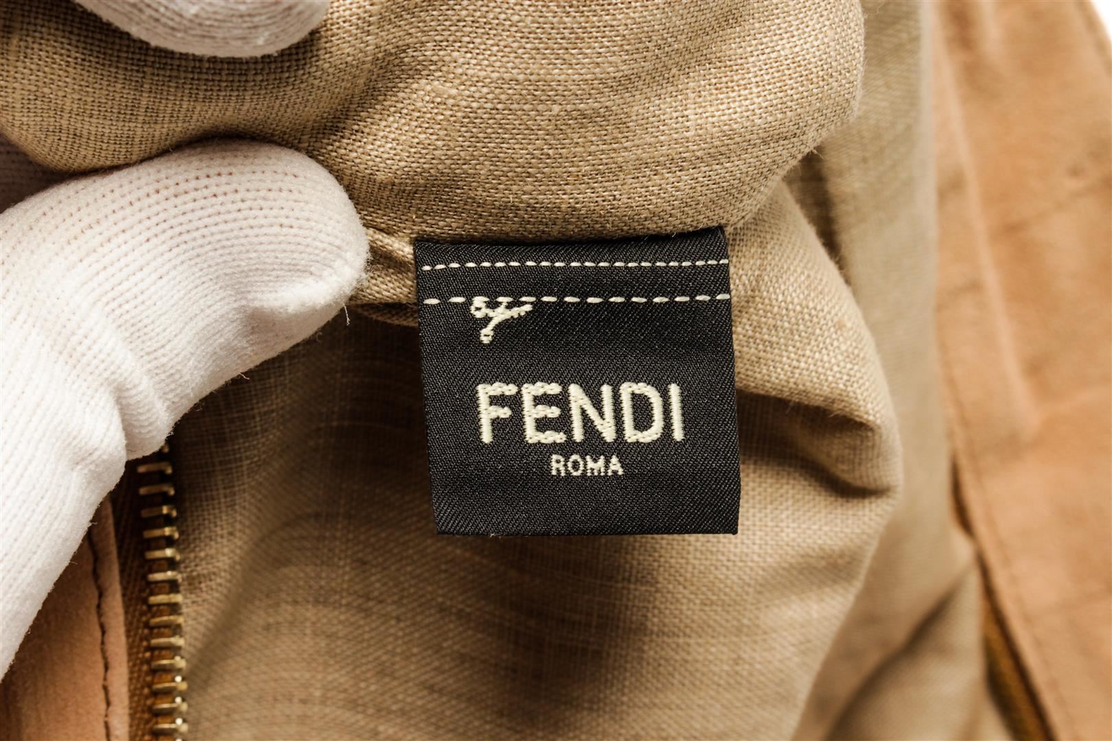 One Fendi Beige Open Tote Suede Handbag. Item is sold AS-IS. All available information is listed in the description and shown in the photo. Fendi Beige Open Tote Suede Handbag with dual brown leather top handles, fabric interior, gold toned hardware and zip closure.