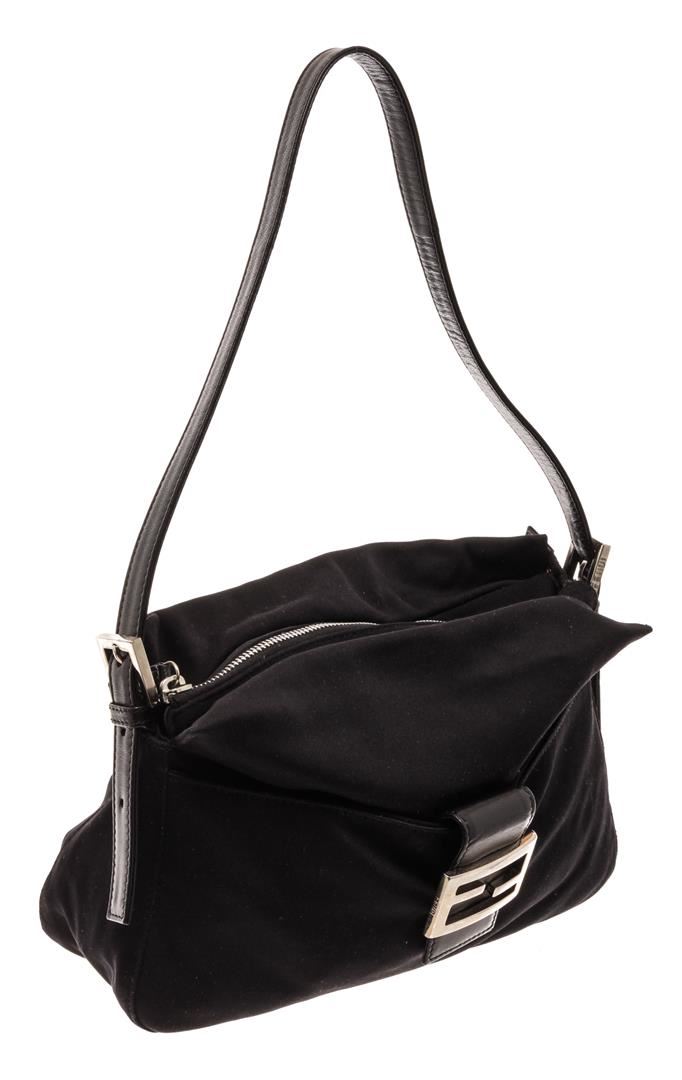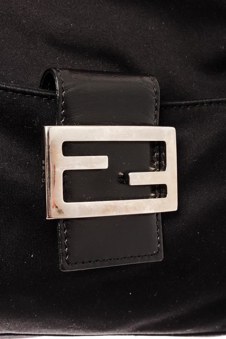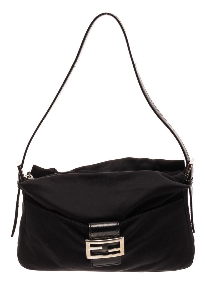 Fendi Black Nylon Shoulder Bag. All available information is listed in the description and shown in the photos. Fendi Black Nylon Shoulder Bag with black canvas, silver-tone hardware, single adjustable shoulder strap, leather trim embellishment, canvas lining & single interior pocket, snap closure at front. Height: 11.25" Width: 11" Depth: 1.5", Shoulder Strap Drop: 11.5" / 28.57 x 27.94 x 3.81 Cm