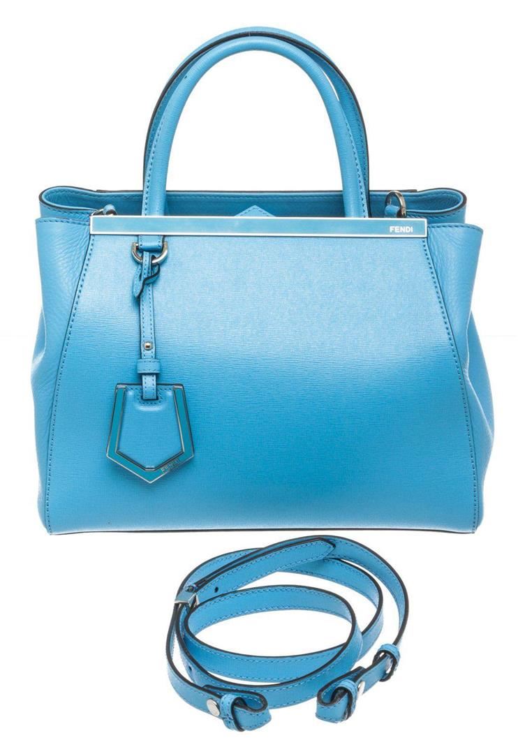 Blue leather Fendi Petite 2Jours tote with silver-tone hardware, flat adjustable shoulder strap, dual rolled top handles, tonal woven striped monogram lining, three interior compartments; one with zip closure and snap closure at front flap. Measurements: Length: 7.5 in / 19 cm Width: 5 in / 13 cm 4 in / 10 cm Condition: Pre-Owned Good overall, please see photographs for detail.