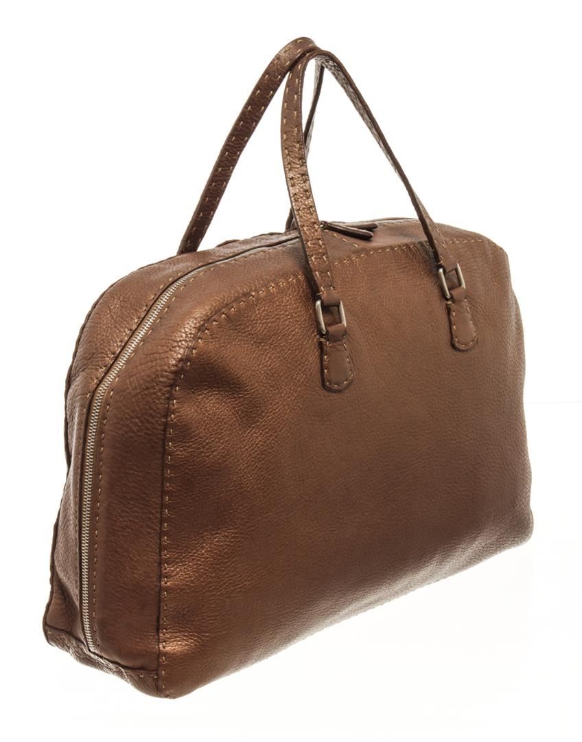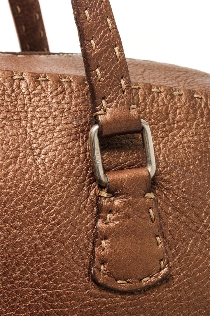 Fendi Bronze Leather Selleria Large Shoulder Bag. All available information is listed in the description and shown in the photos. Fendi Bronze Leather Selleria Large Shoulder Bag with top handle, silver hardware, suede lining, interior pocket, zipper closure. W: 14.96" x H: 10.82" x D: 4.133" Inches / W38CM X H27.5CM X D10.5cm Handle High: 13cm