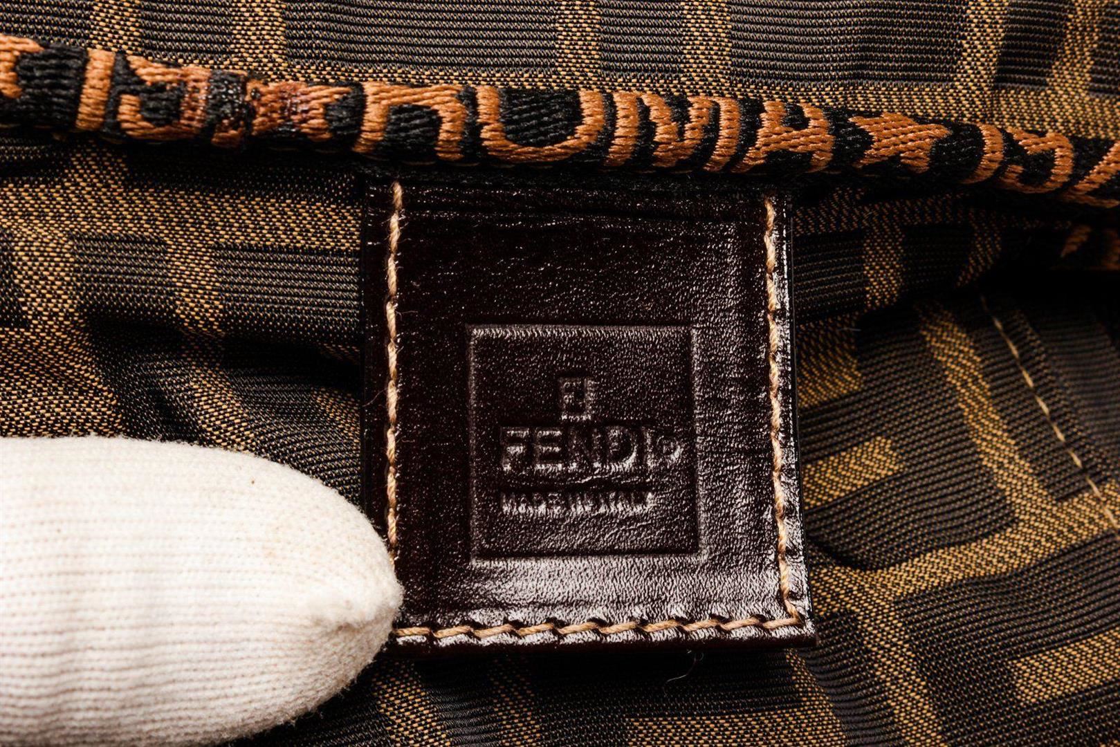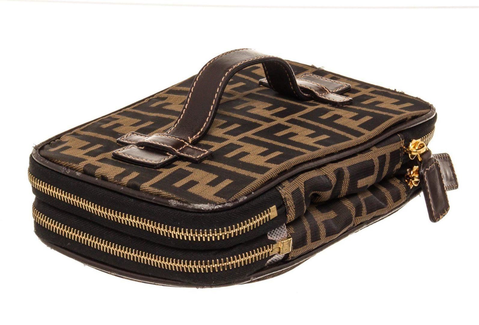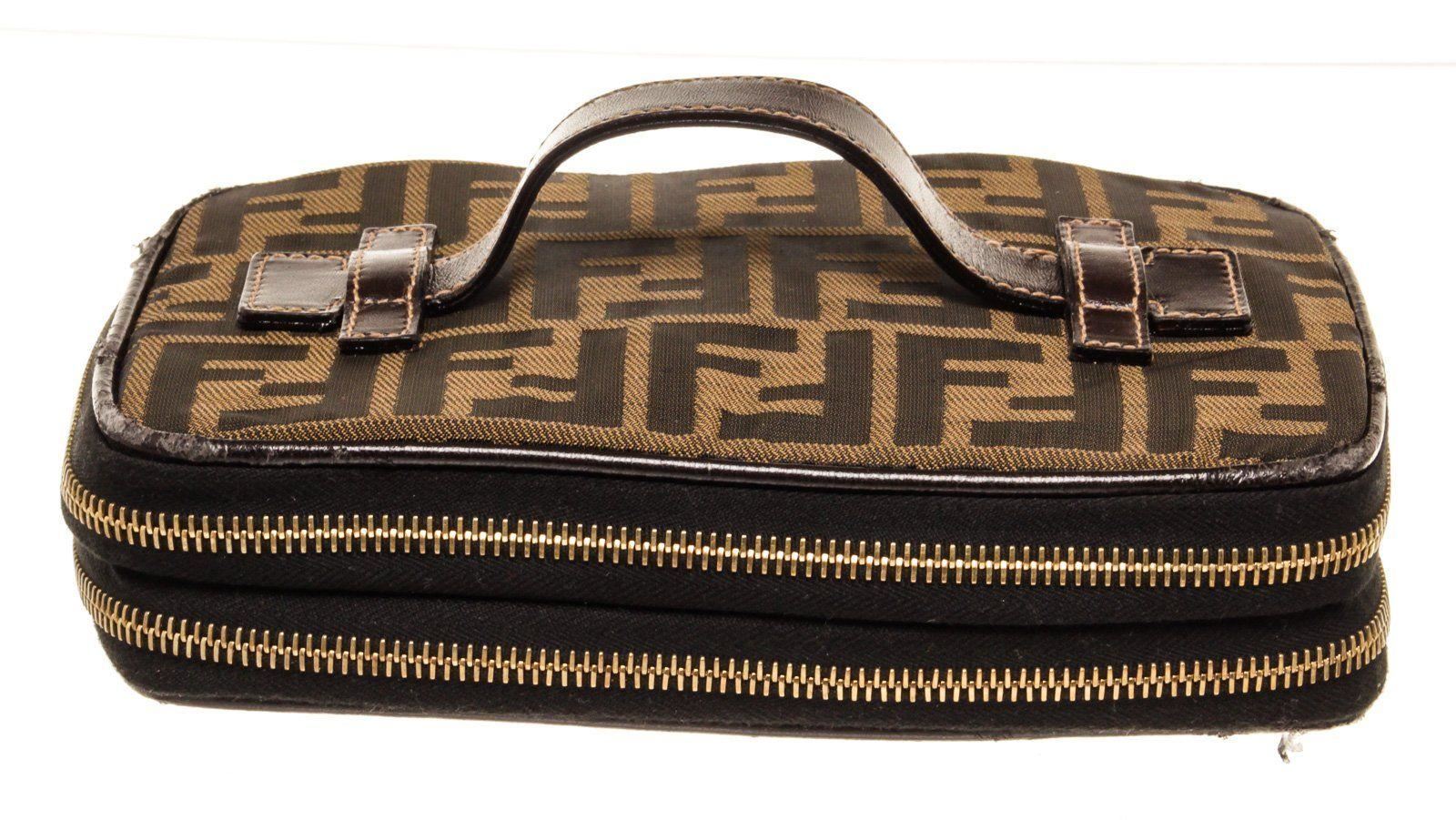 Fendi Brown Canvas Vanity Case Handbag with material leather, gold-tone hardware, top handle and zipper closure.