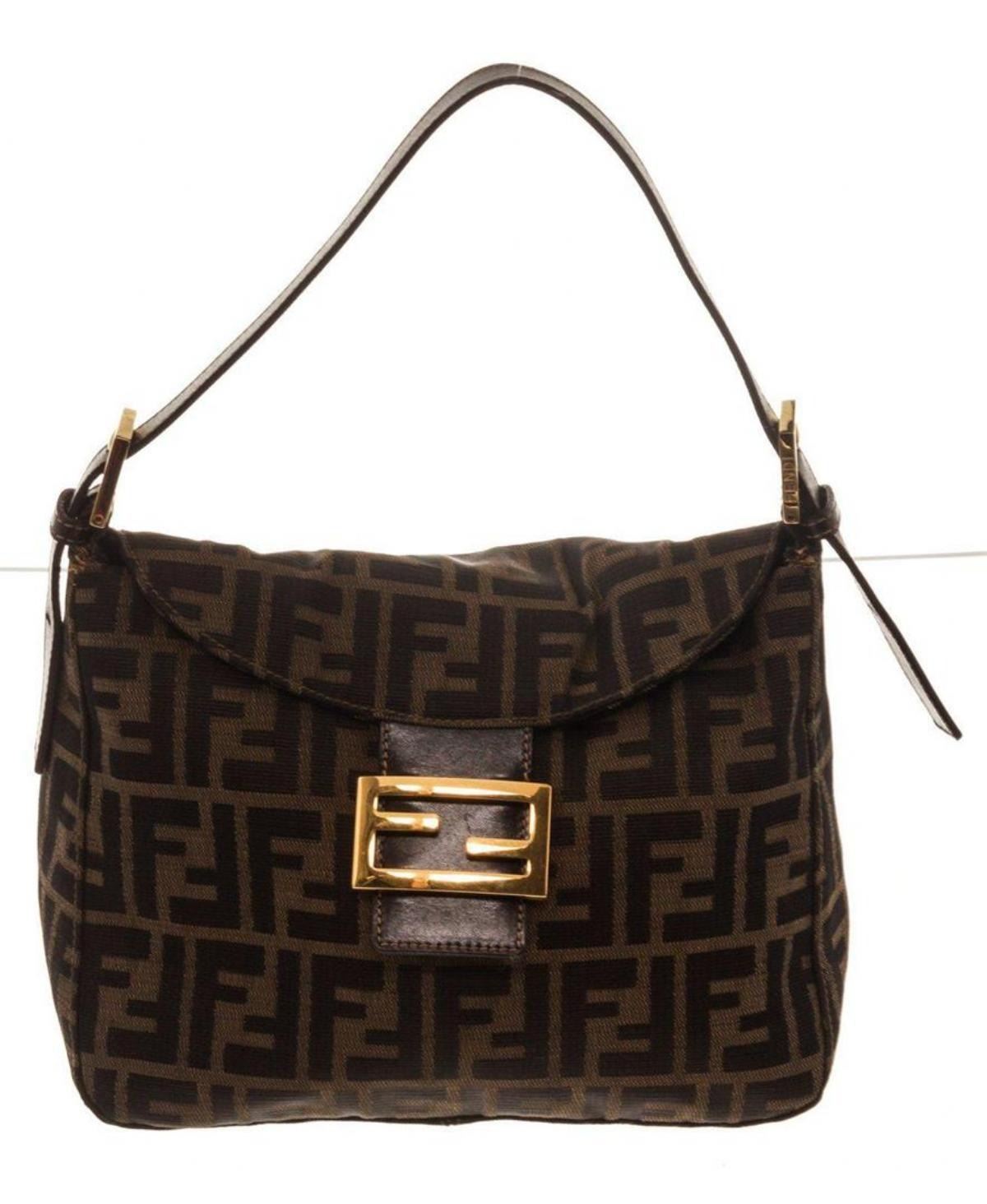 Fendi Brown Canvas Zucca Shoulder Bag with material canvas, gold-tone hardware, interior slip pocket, shoulder strap and snap closure.