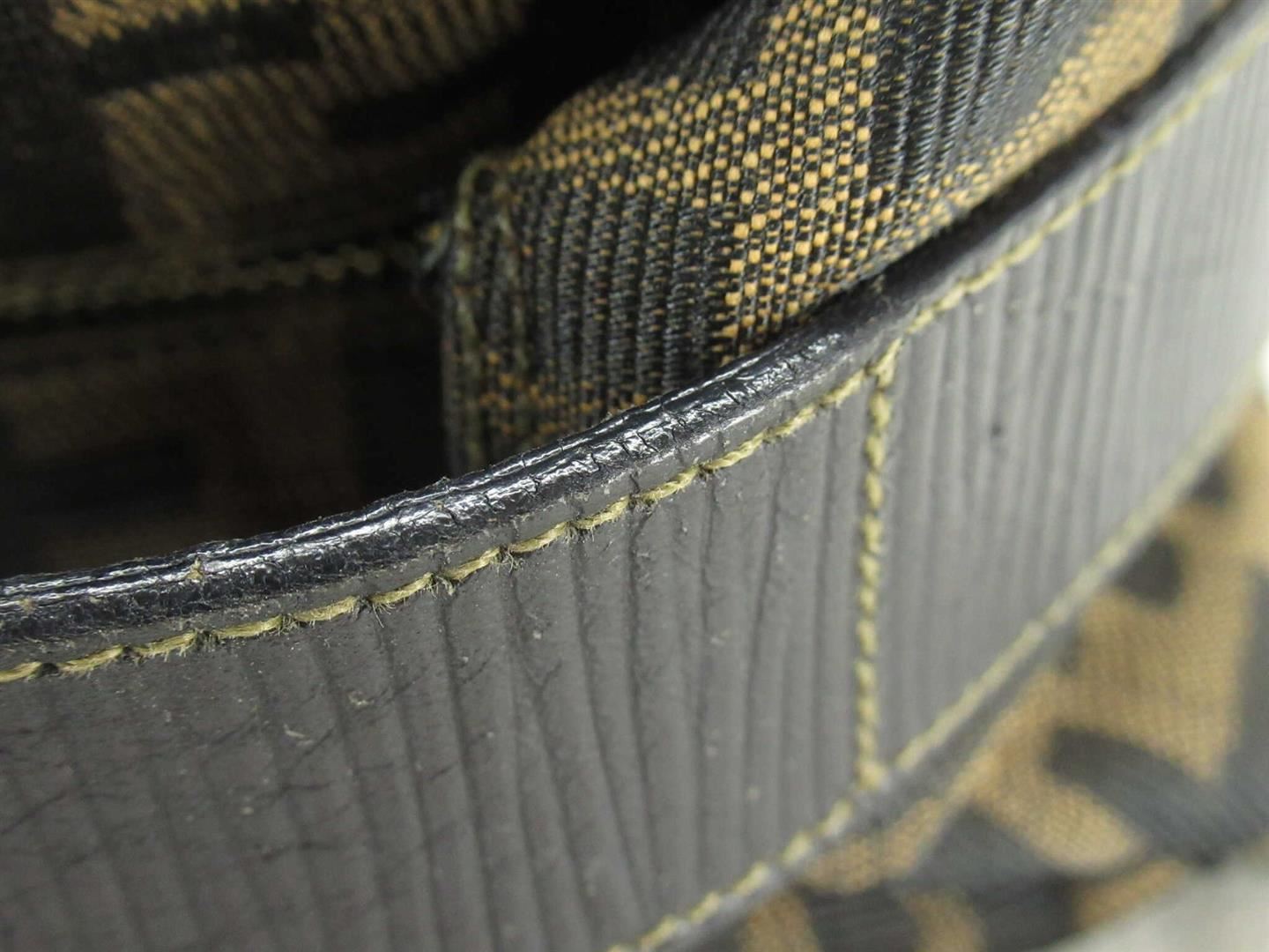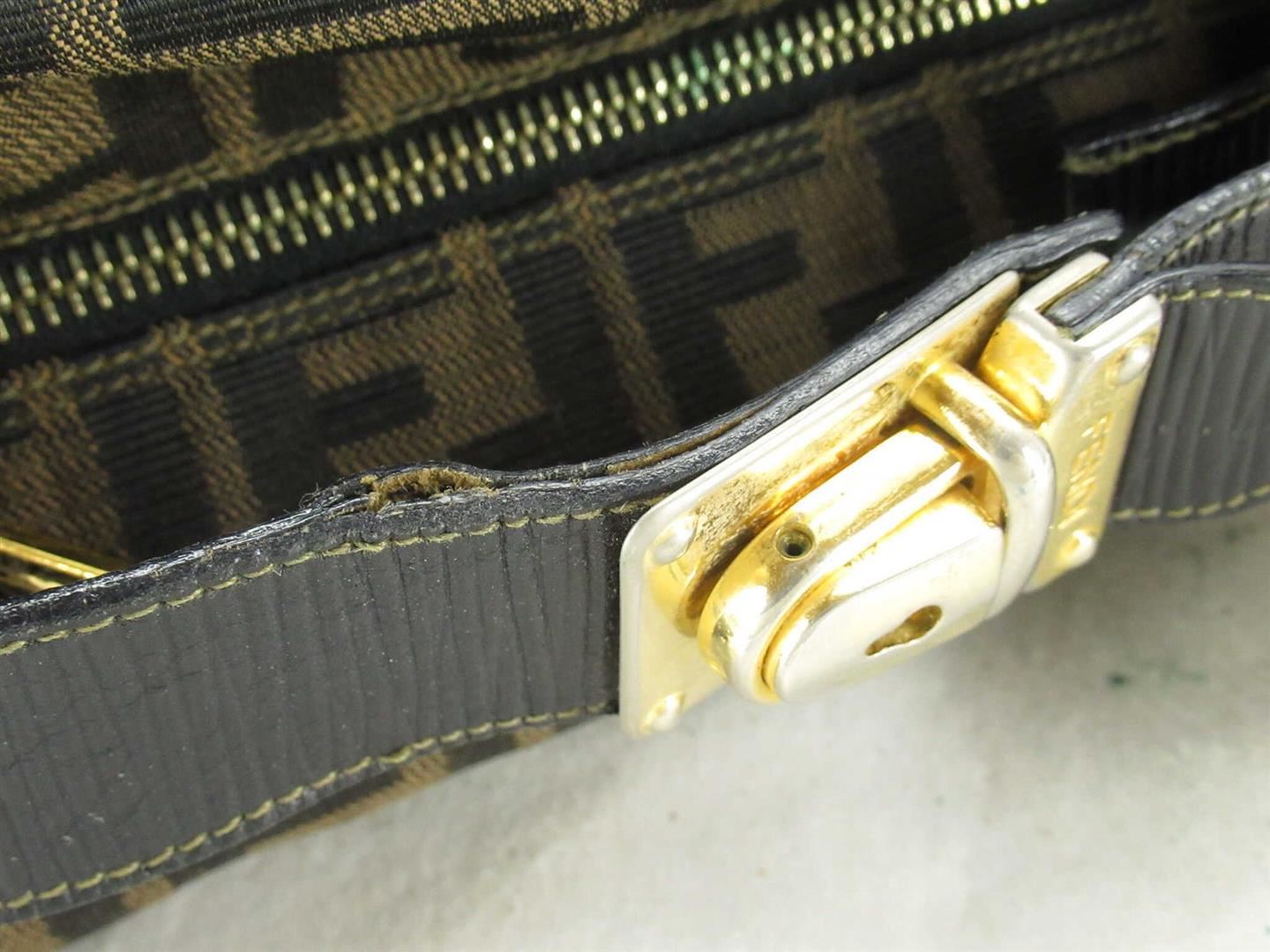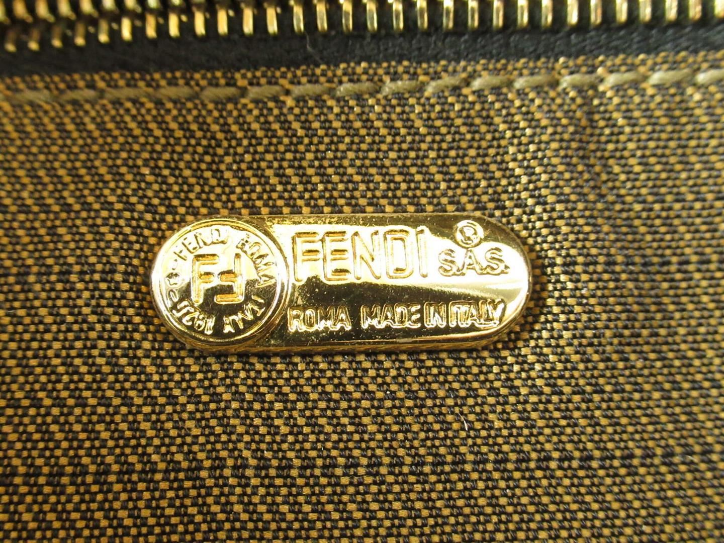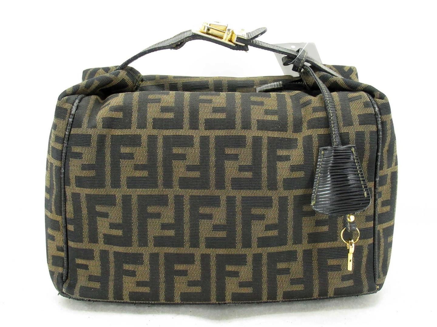 Fendi Brown Zucca Canvas Vanity Cosmetic Bag features Zucca print canvas, brown leather trim and a unique top handle with a gold-tone lock. With a zipper closure, it opens up to a beige canvas-lined interior with one zipped pocket.
