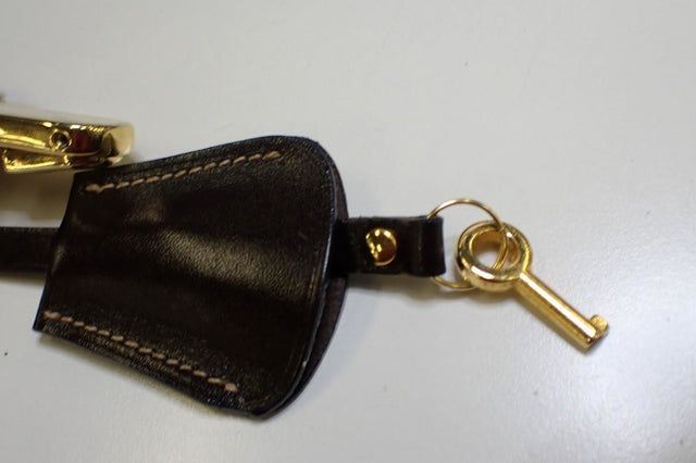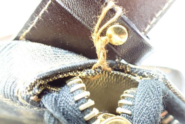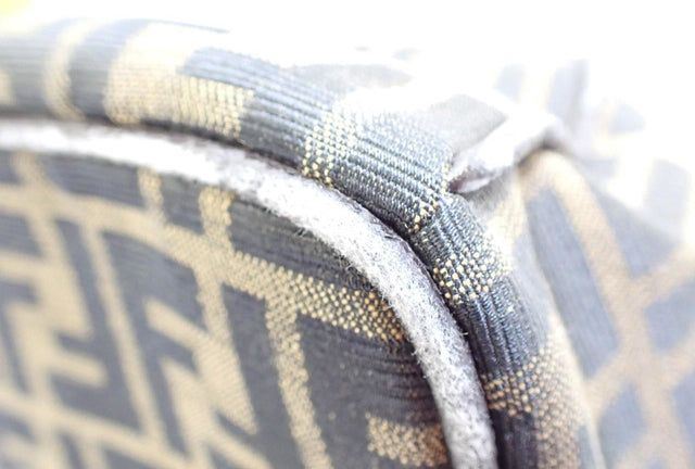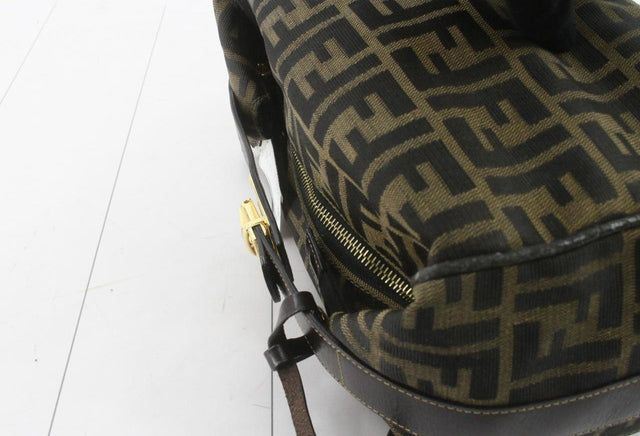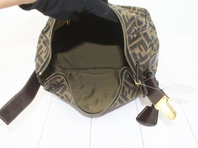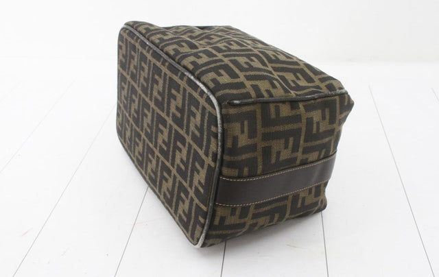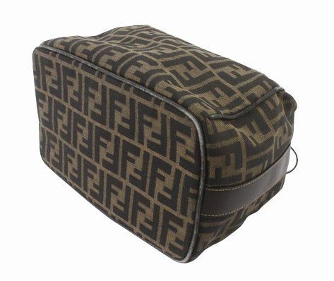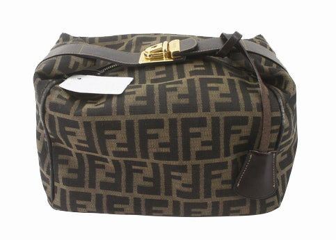 Made from Zucca printed canvas, it features a brown leather trim and a unique top handle with a gold-tone lock. With a zipped closure, it opens up to a beige canvas-lined interior with one zipped pocket.
