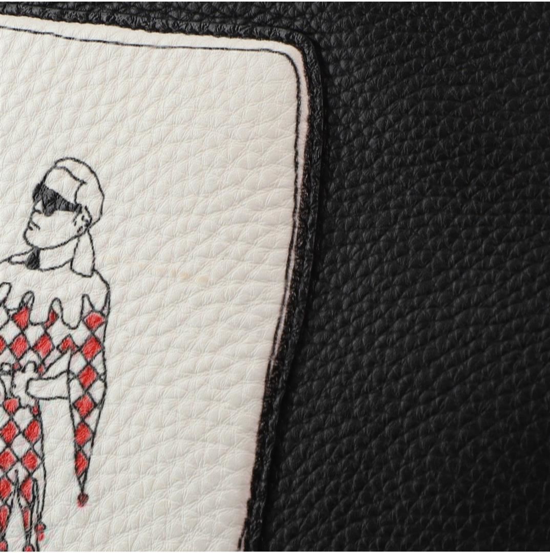 One Fendi Jokarl Pouch Printed Leather Medium Black. Item is sold AS-IS. All available information is listed in the description and shown in the photo. Fendi Jokarl Pouch Printed Leather Medium Black Condition Details: Marks and wear on front leather applique, scratches on hardware. Height 8", Width 11.5", Depth 0.5", Strap Drop None