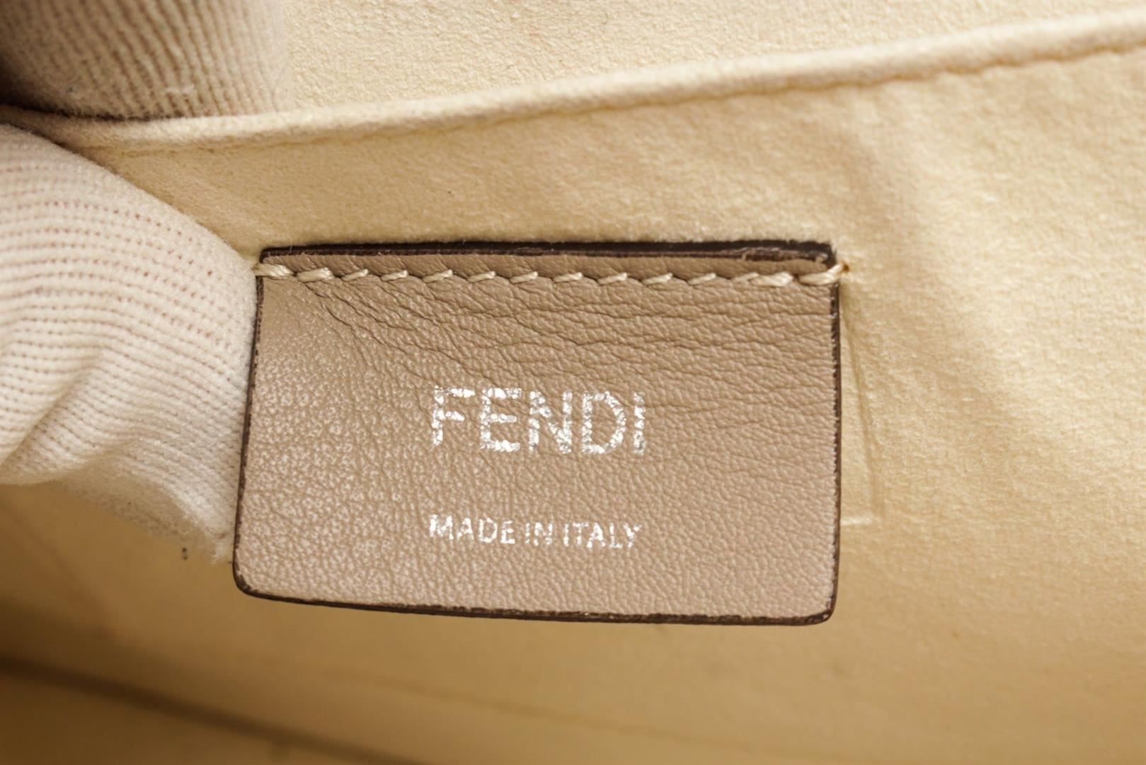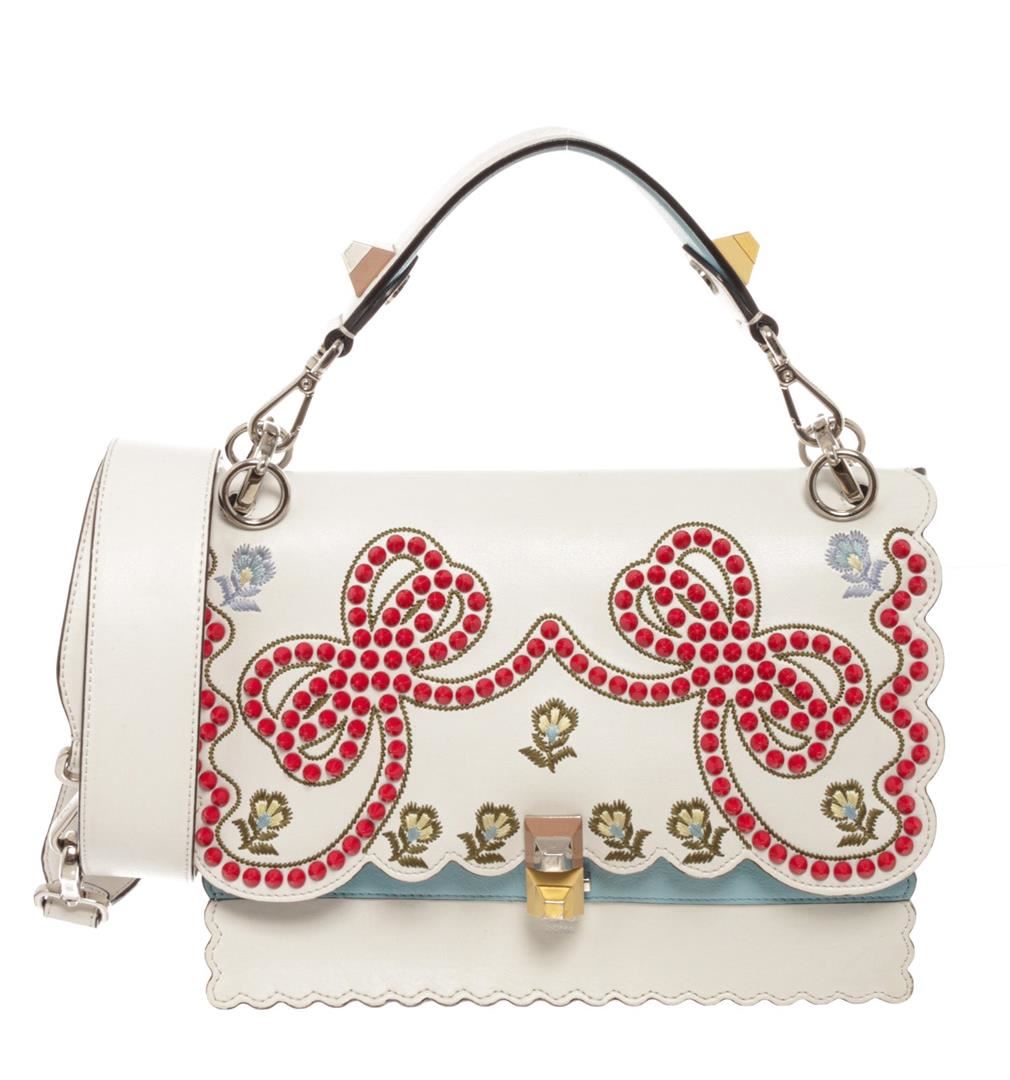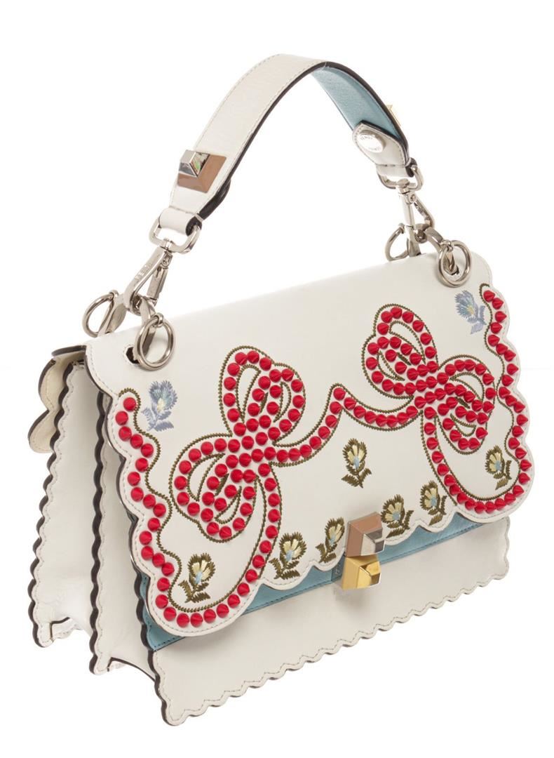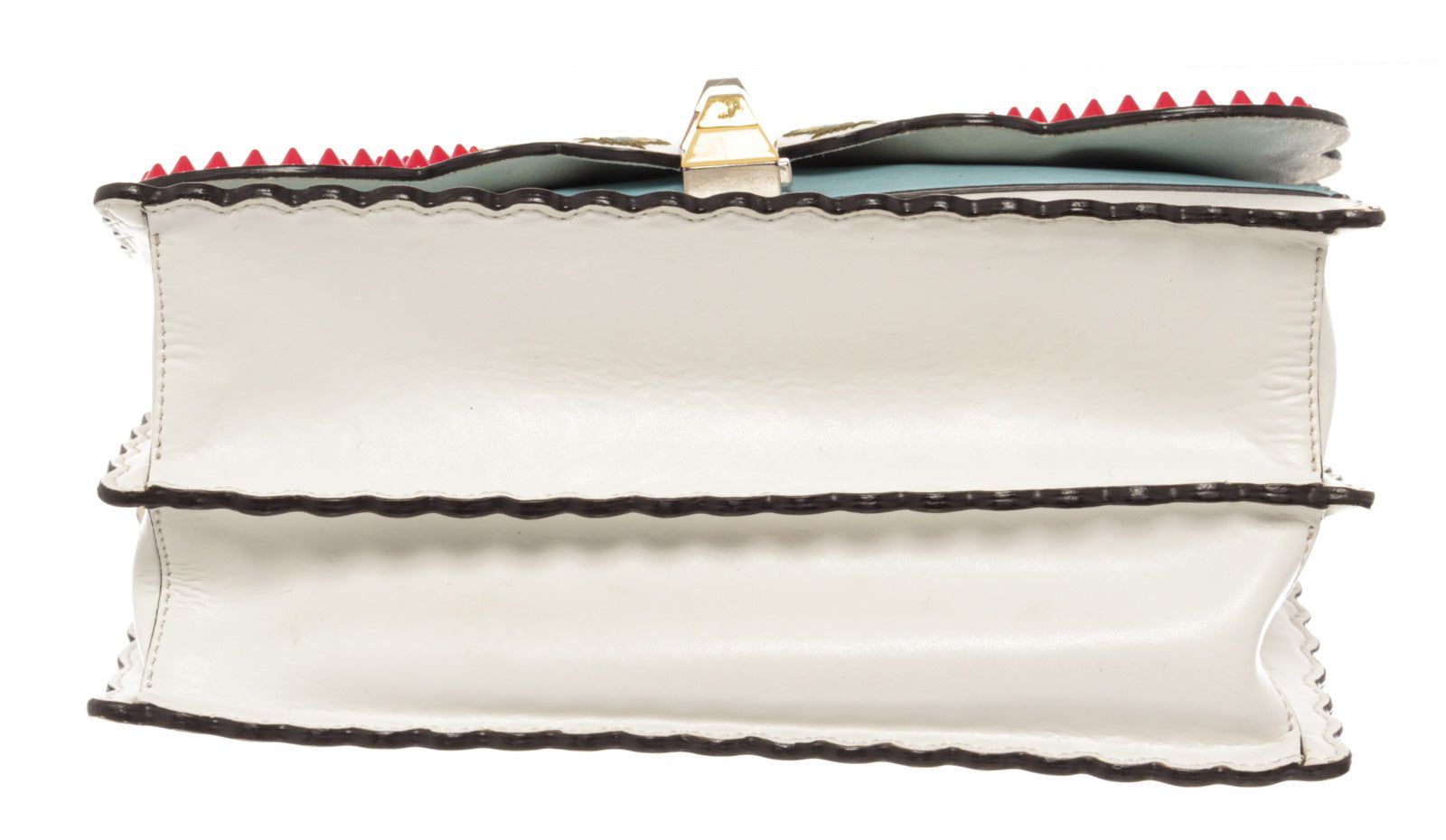 White multicolor Fendi Kan I shoulder bag with studded bow embroidered, a front flap with a stud closure, top leather handle and shoulder strap, beige suede leather interior with two interior compartments, a small patch pocket and silver-tone hardware.