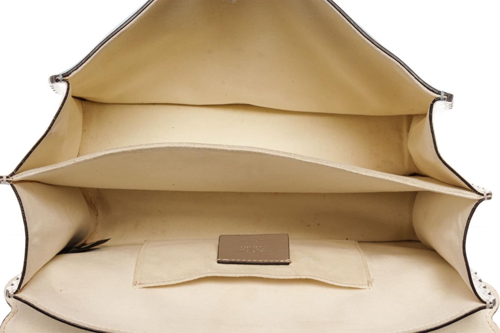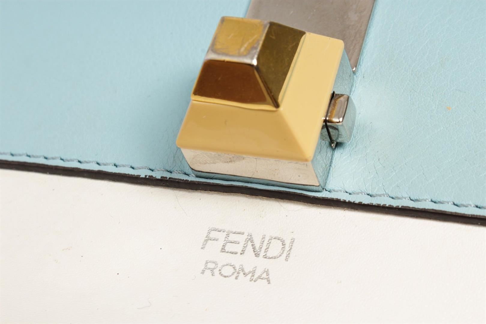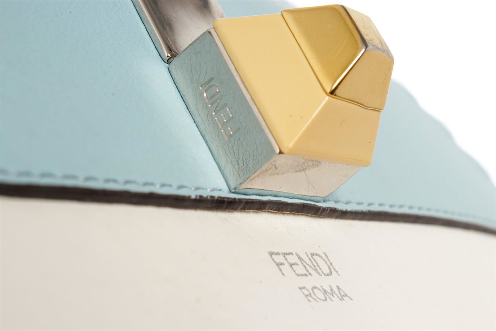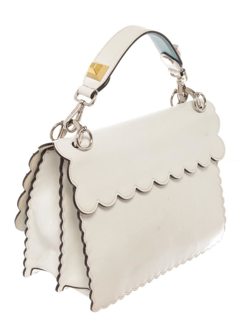 White multicolor Fendi Kan I shoulder bag with studded bow embroidered, a front flap with a stud closure, top leather handle and shoulder strap, beige suede leather interior with two interior compartments, a small patch pocket and silver-tone hardware.