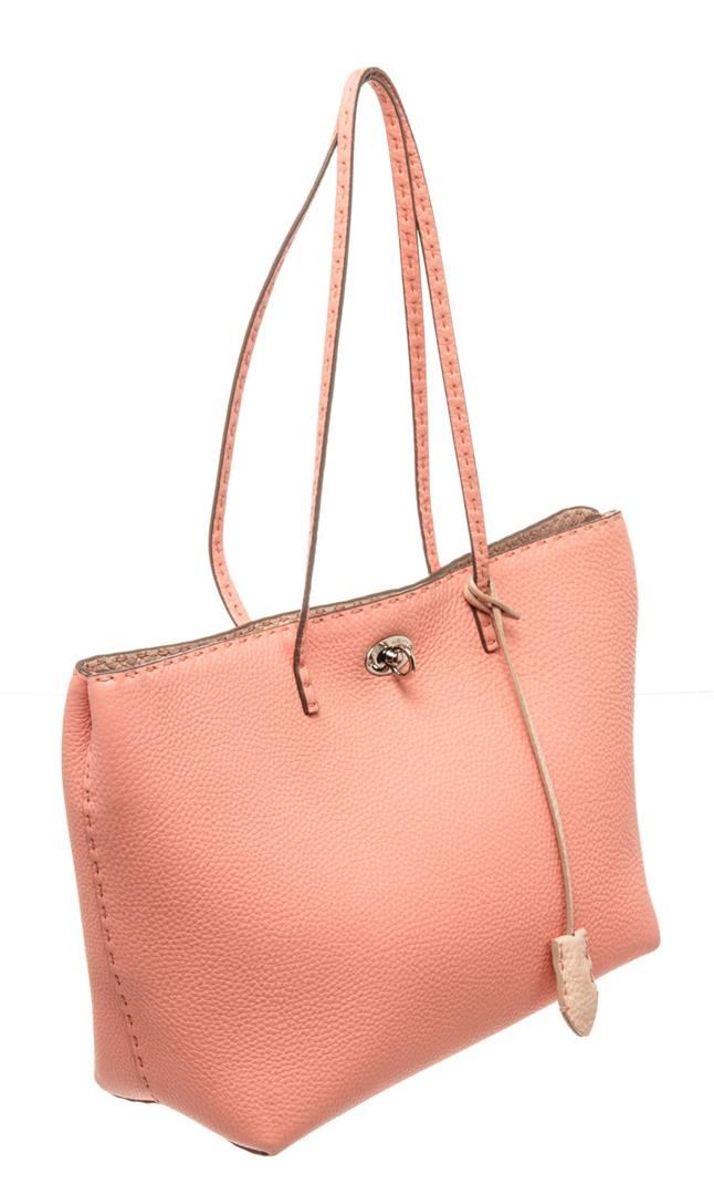 One Fendi Pink Leather Selleria Tote Bag. Item is sold AS-IS. All available information is listed in the description and shown in the photo. Fendi Pink Leather Selleria Tote Bag with gold-tone hardware, trim leather, shoulder strap and flap closure.