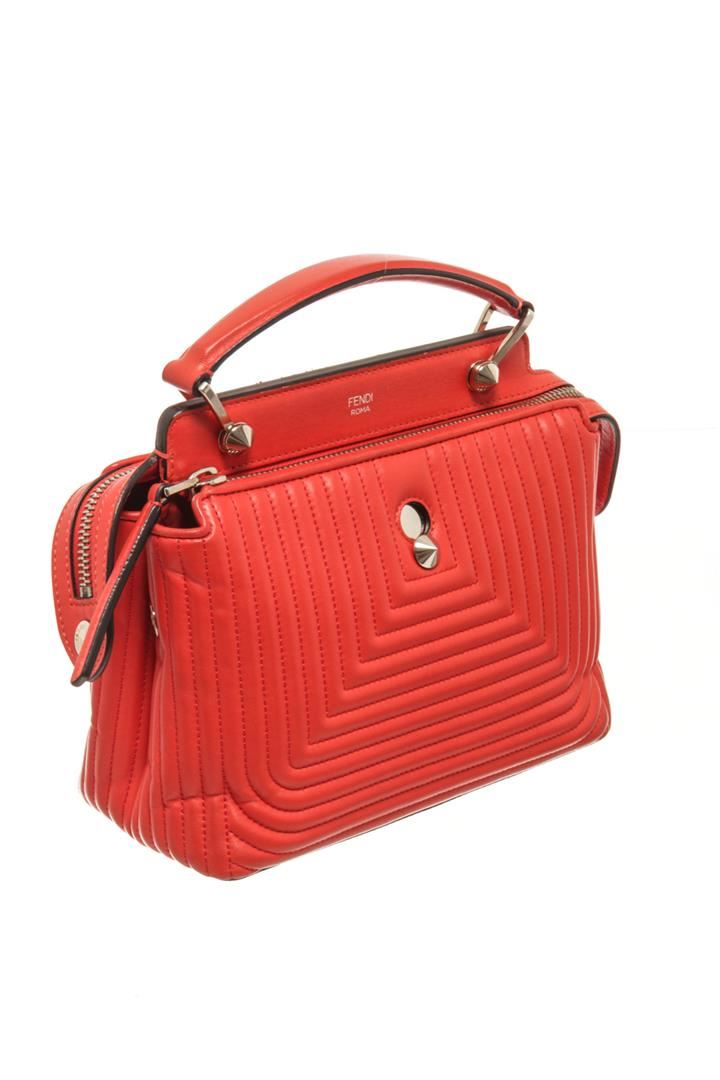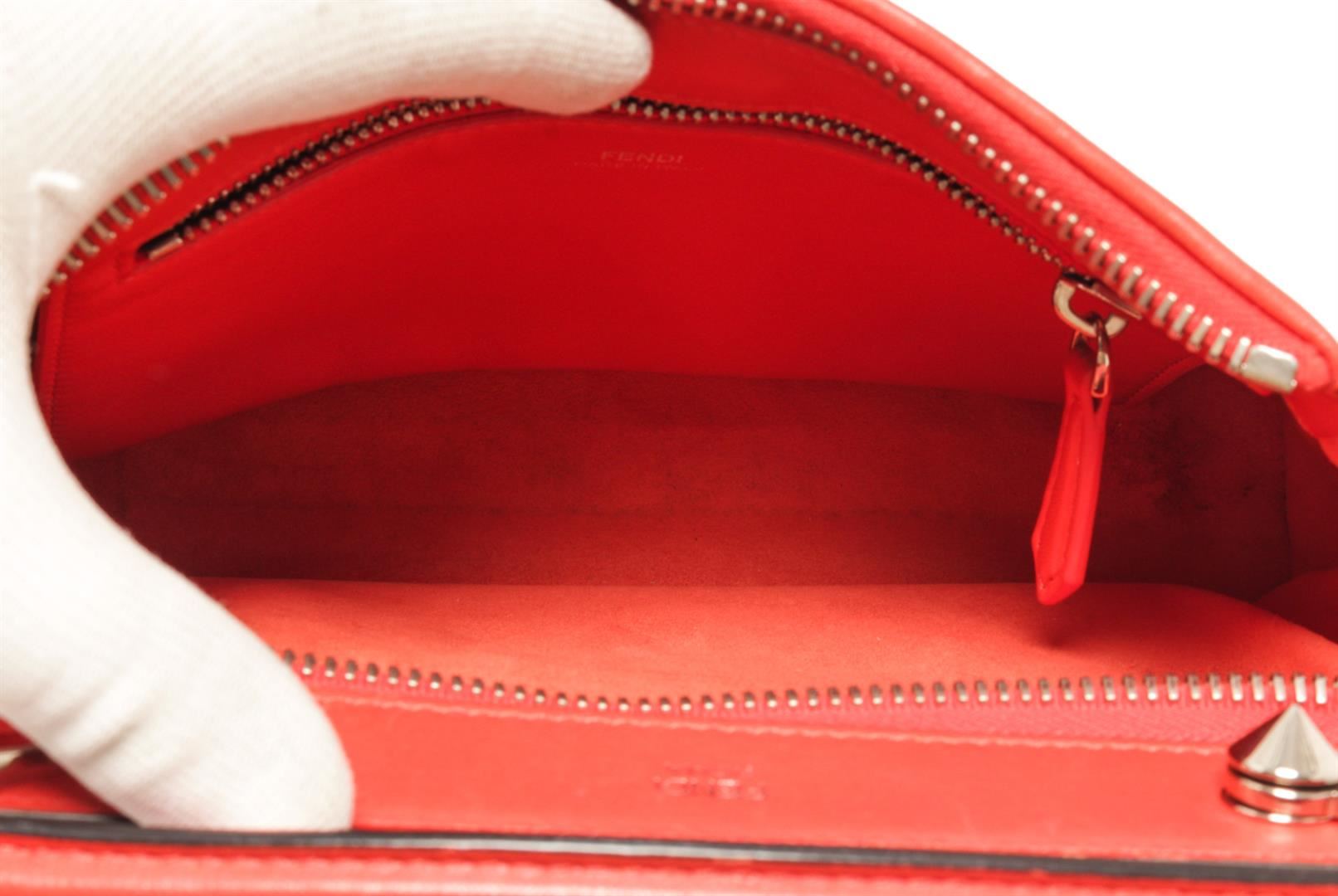 One Fendi Red Leather DotCom Click Top Shoulder Bag. Item is sold AS-IS. All available information is listed in the description and shown in the photo. Fendi Red Leather DotCom Click Top Shoulder Bag with features a flat top handle, two zip top compartments with snap ends, distinctive conical stud embellishment, silver-tone hardware, detachable strap, suede lining. Height: 6" Width: 9" Depth: 4.5" , Handle Drop: 3" / 15.24 x 22.86 x 11.43 Cm