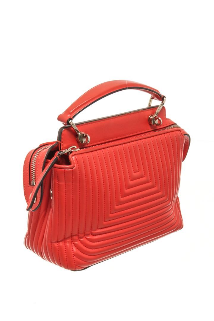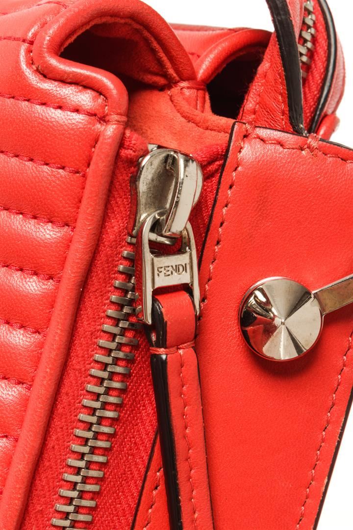 One Fendi Red Leather DotCom Click Top Shoulder Bag. Item is sold AS-IS. All available information is listed in the description and shown in the photo. Fendi Red Leather DotCom Click Top Shoulder Bag with features a flat top handle, two zip top compartments with snap ends, distinctive conical stud embellishment, silver-tone hardware, detachable strap, suede lining. Height: 6" Width: 9" Depth: 4.5", Handle Drop: 3" / 15.24 x 22.86 x 11.43 Cm