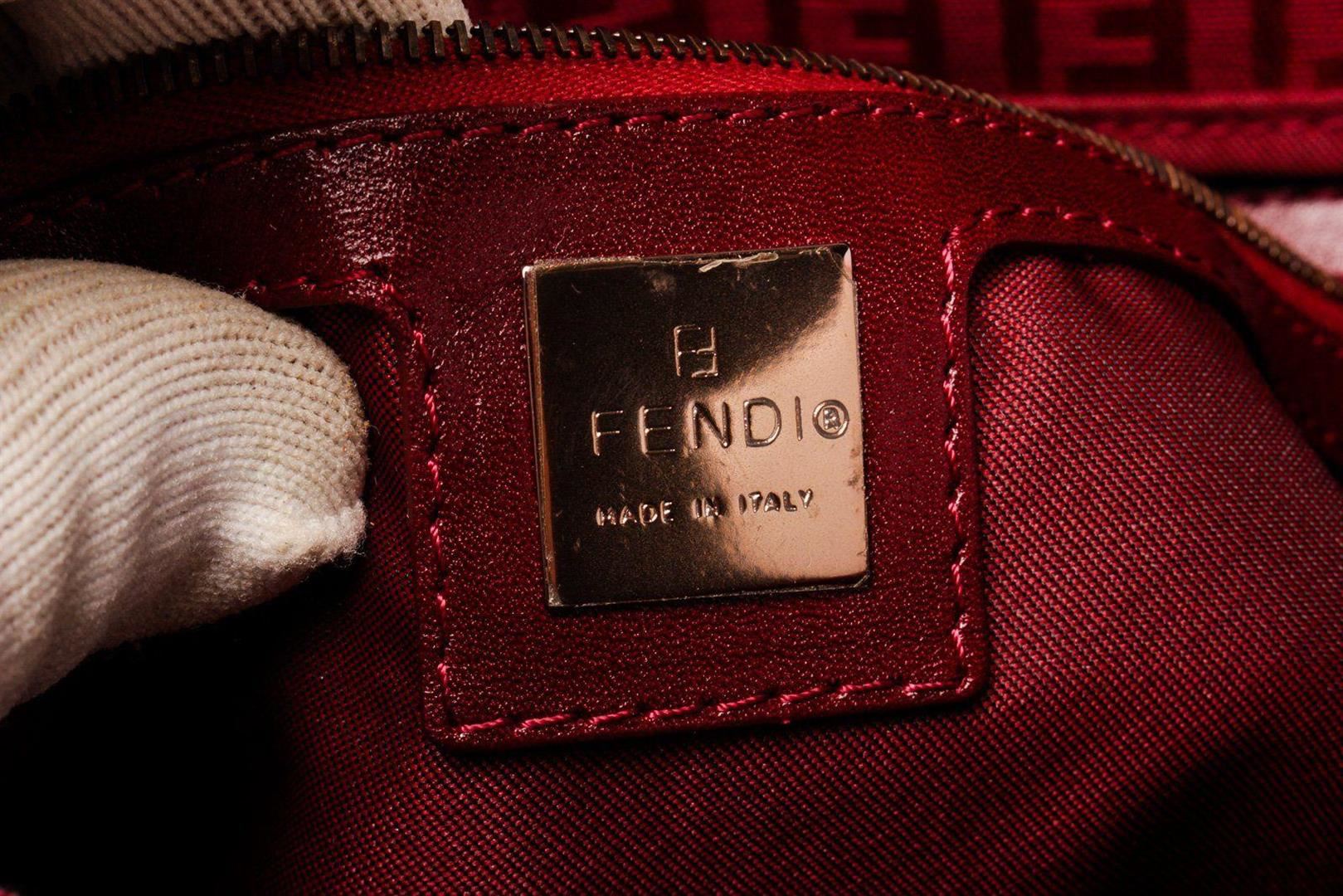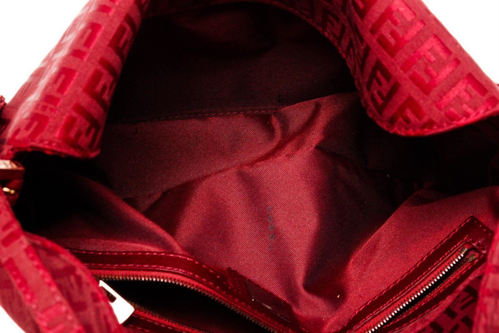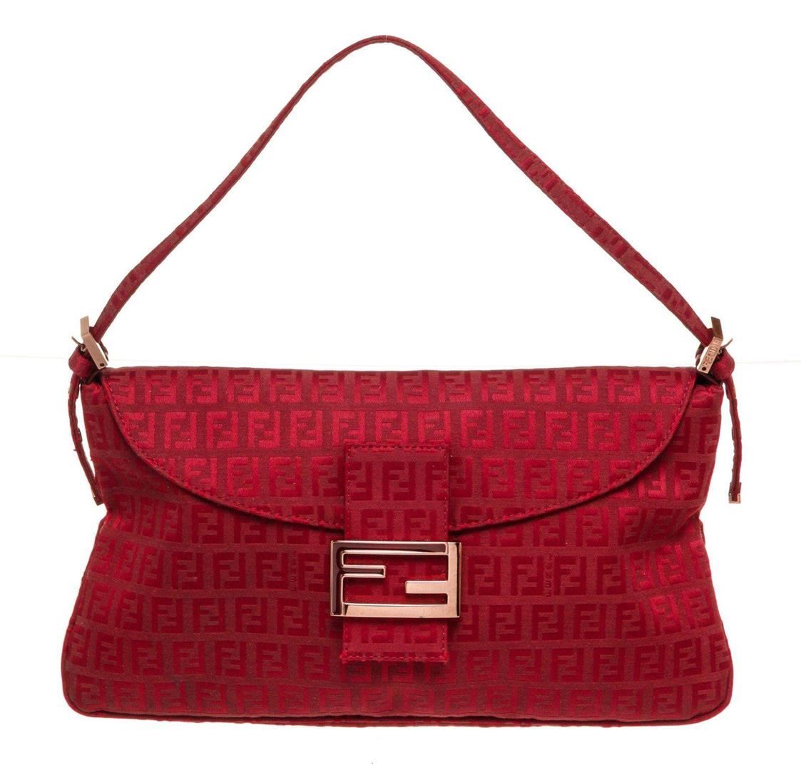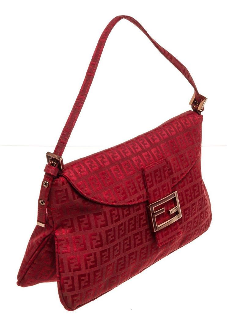 Fendi Red Mamma Baguette Hobo Bag with gold-tone hardware, trim leather, interior zip pockets, leather lining, shoulder strap and snap closure.