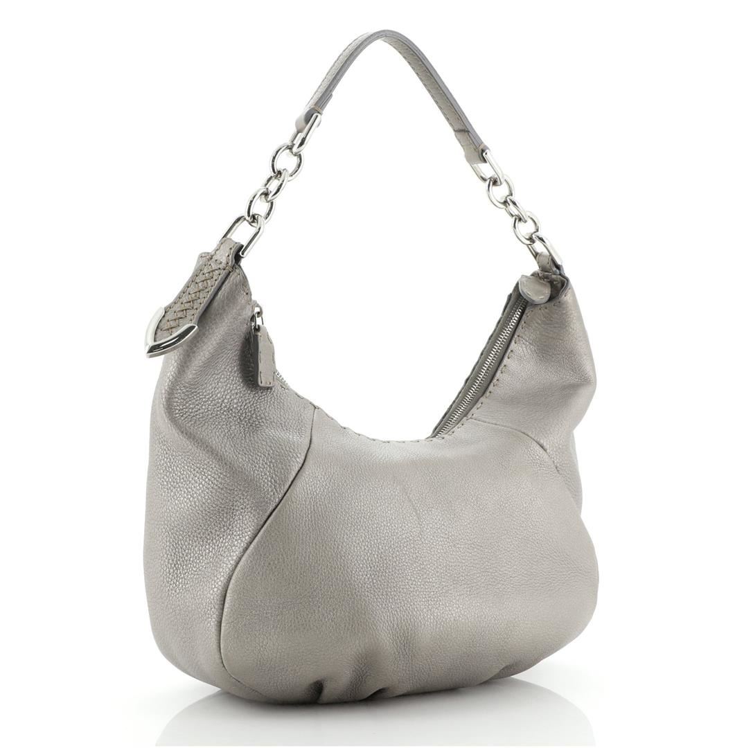 One Fendi Selleria Chain Hobo Leather Small Silver. Item is sold AS-IS. All available information is listed in the description and shown in the photo. Fendi Selleria Chain Hobo Leather Small Silver Condition Details: Heavy splitting and cracking on strap and opening trim wax edges. Minor wear and scuffs on exterior, glue stains on opening trim, scratches on hardware. Height ", Width ", Depth ", Strap Drop 10