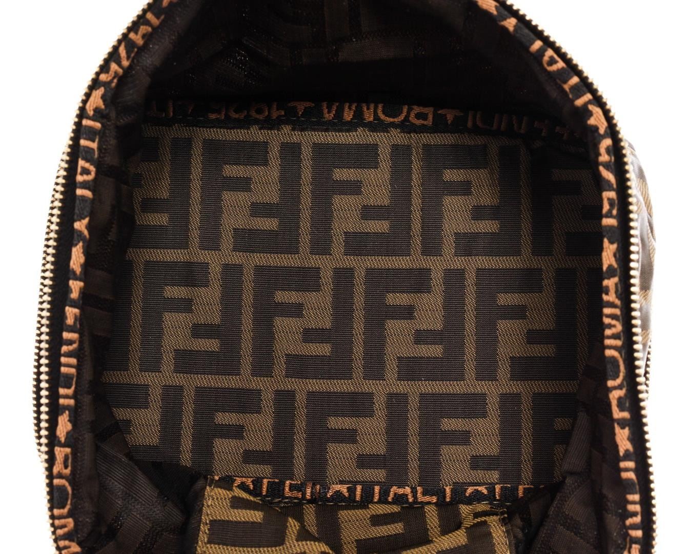 Classic Tobacco Zucca Monogram print on Fendi cosmetic vanity bag with one main compartment. It has gold-tone zip around the top of main compartment with leather zipper pull tag and gold-tone Fendi logo. Please note: Black piping is peeling. 8.25" x 5.5" x 6"