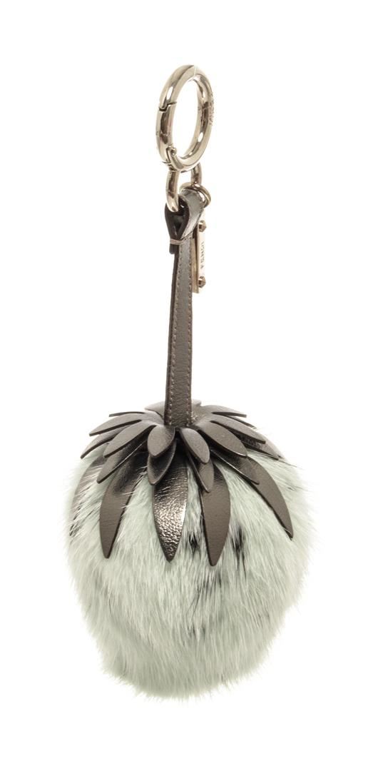 One Fendi White Leather Fruit Bag Charm. Item is sold AS-IS. All available information is listed in the description and shown in the photo. "fendi fruit bag charm fur and leather gray green fur leather" Height 7", Width 4", Depth ", Strap Drop None / 17.78 x 10.16 Cm