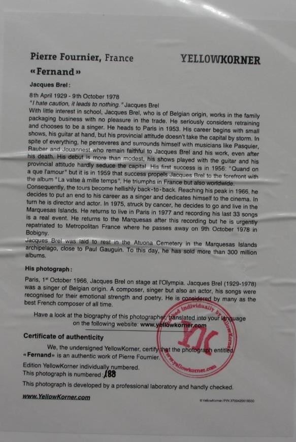 Fernand Certified Photograph, Pierre Fournier YellowKorner Certified Photograph. Certificate of Authenticity from YellowKorner affixed to the back. Matted Dimensions 16"x20". Protected with Clear Mylar Sleeve.