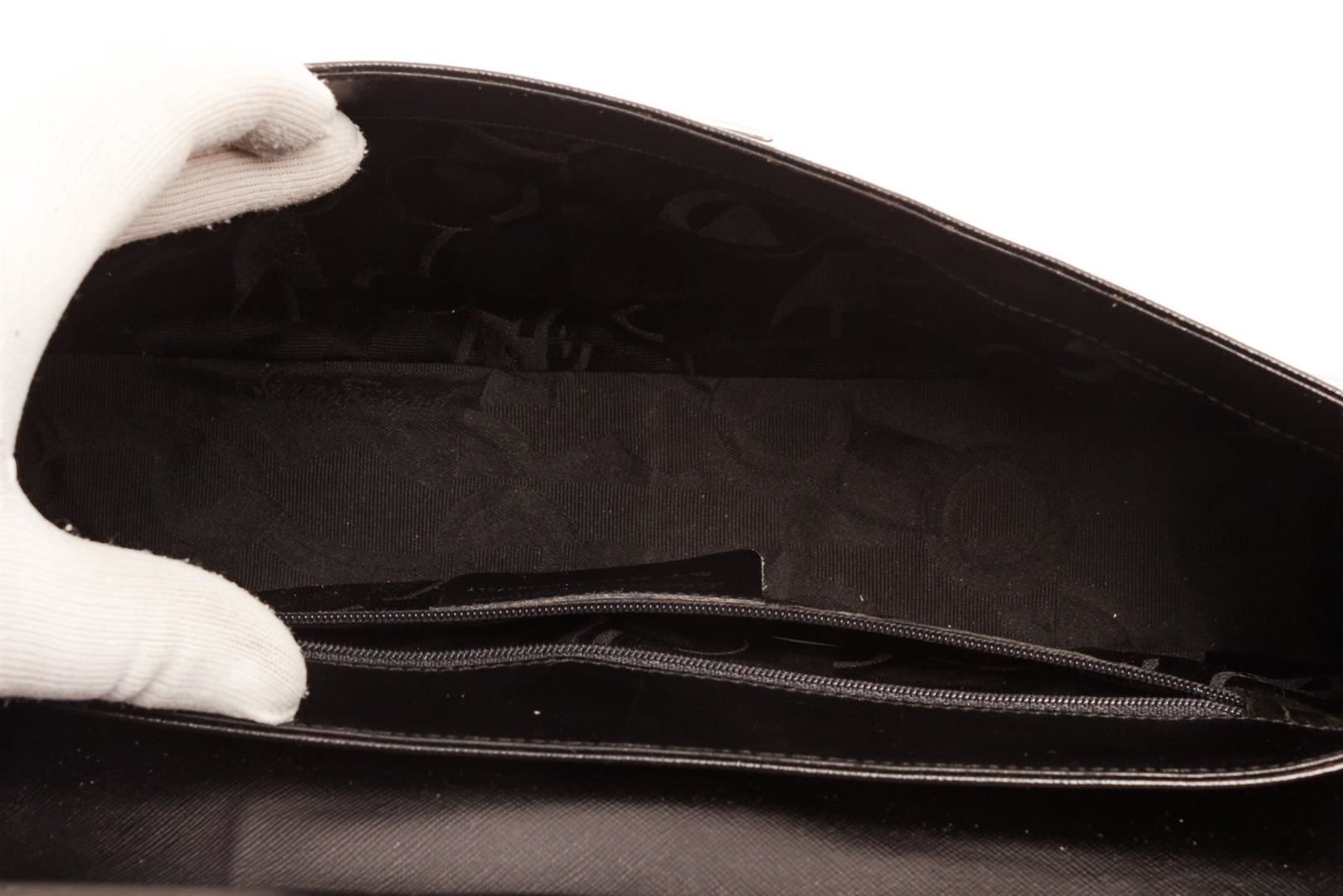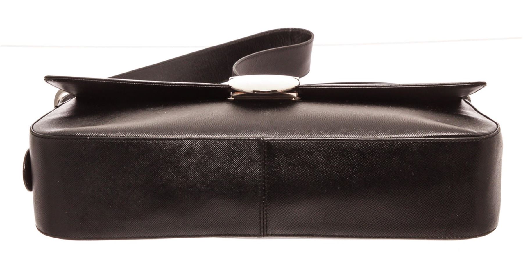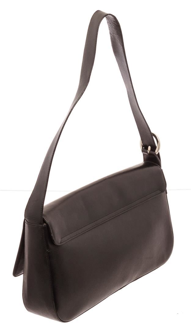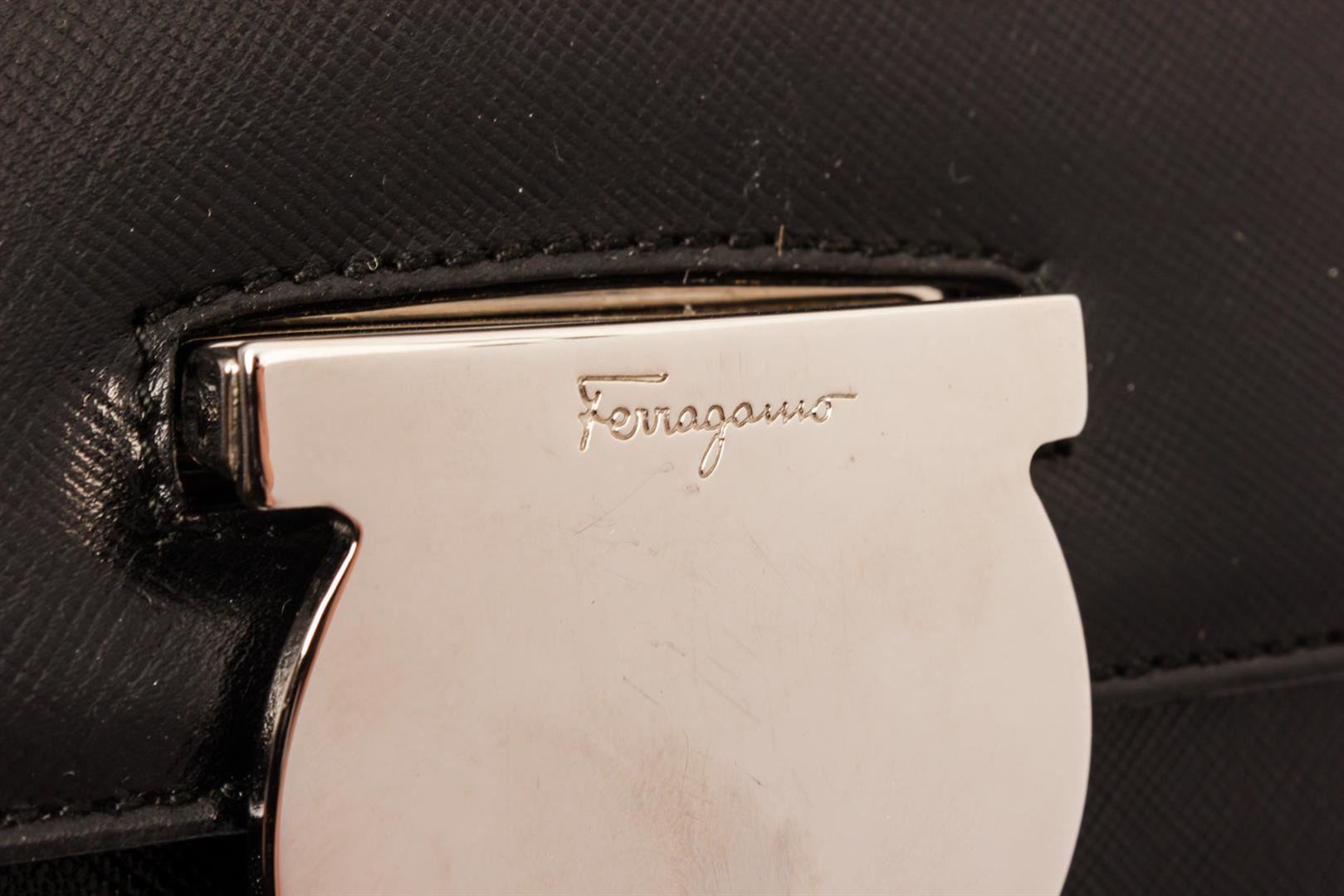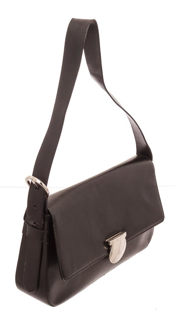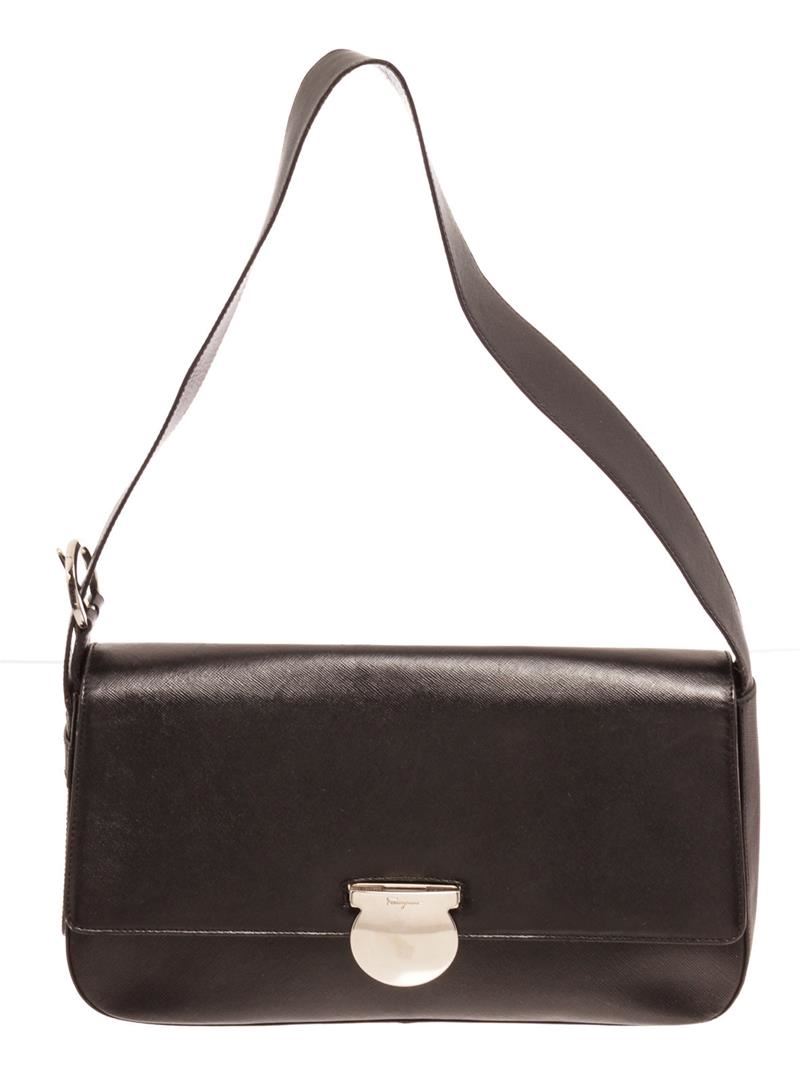 Ferragamo Black Leather Shoulder Bag with silver-tone hardware, single shoulder straps, turn-lock closure at front closure.