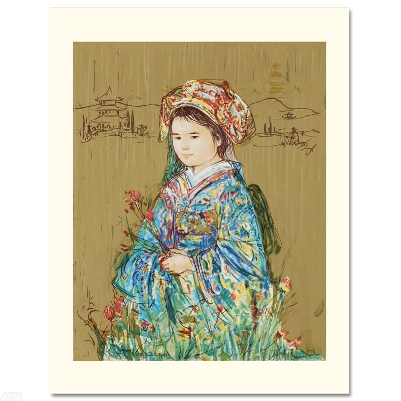 "Festival Kimono" is a limited edition serigraph on paper, numbered and hand signed by Edna Hibel (1917-2014). Includes Certificate of Authenticity! Measures approx. 15" x 20.5" (with border), 12" x 15" (image).