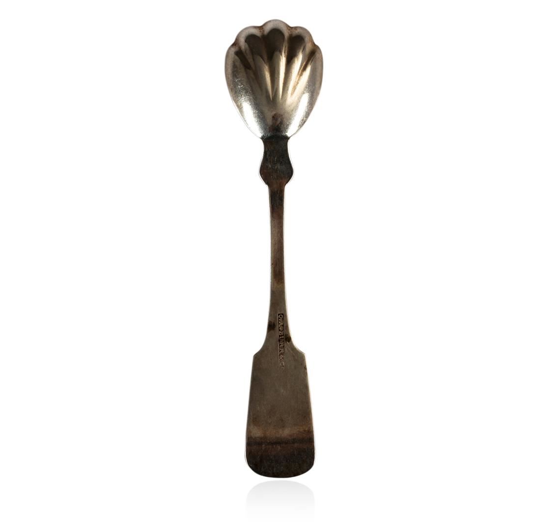 Antique coin silver salt/mustard spoon with shell bowl. Fiddle tip pattern by C A Burr, NY 1857-1863. Rare mono "Mary".