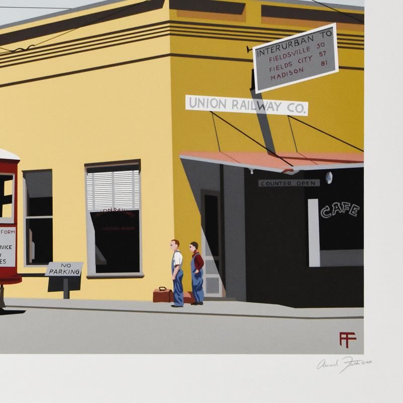 "Fieldsville Trolley" is a limited edition hand pulled original serigraph on paper by Armond Fields (1930-2008), numbered and hand signed by the artist. Includes Letter of Authenticity. Measures approx. 36" x 22" (border), 28" x 16" (image).