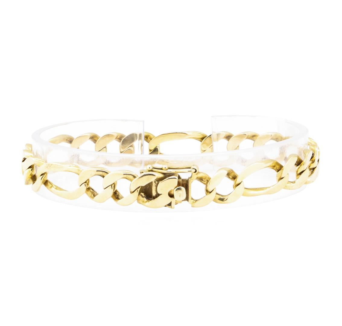 One Figaro link bracelet measuring approximately eight inches in length and 9mm in width featuring: 18KT yellow gold weighing 28.0 grams.